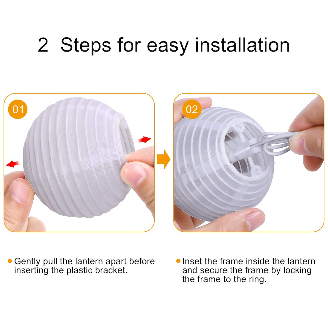 Two Steps Assemble for the Lantern String Lights: Step 1: Please Pull the lantern apart before Inserting the Plastic Bracket(Our workers already assemble the Frame for you). Step 2: Please Insert the Frame inside the lantern and Secure the Frame by Locking the Frame to the Ring.