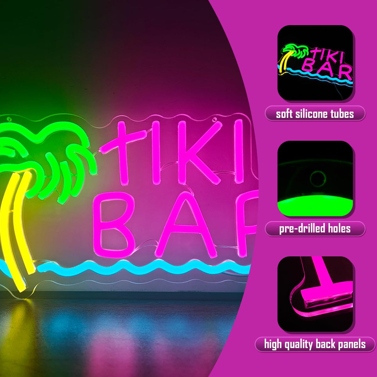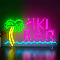 Q: What makes the Tiki Bar Neon Sign a stylish addition to my decor?A: The Tiki Bar Neon Sign features a fashionable design with bright colors that enhance the visual appeal of any space, making it a perfect addition to bars, lounges, bedrooms, and other areas where you want to create a lively atmosphere.