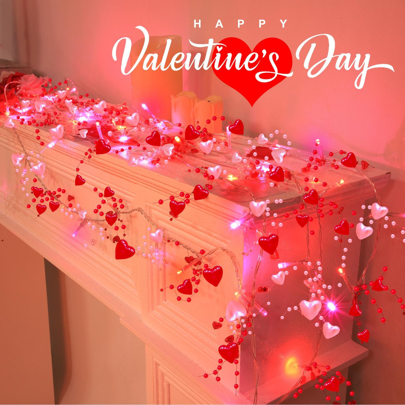 ?Specifications?Quantity: 2 Pack Valentine's Day Hearts Beaded String Lights.Length: 2Pack Total 13 feet in length, with each string being 6.5 feet long.LEDs: 20 on each string,Colors: red and pink.Design: hearts-shaped, beadedPower Source: requires 3 AA batteries (not included).Timer Function: Automatic timer with 6 hours on and 18 hours off cycle.Lighting Modes: Two modes available - steady and flashing.Indoor/Outdoor Use: Suitable for both indoor and outdoor decoration.Waterproof: String lights are waterproof, but the battery box is not.Versatile Decoration: Ideal for decorating door frames, window frames, fireplace mantels, railings, dining tables, bookshelves.?Package Included?2 x Valentine's Day Hearts Beaded String Lights