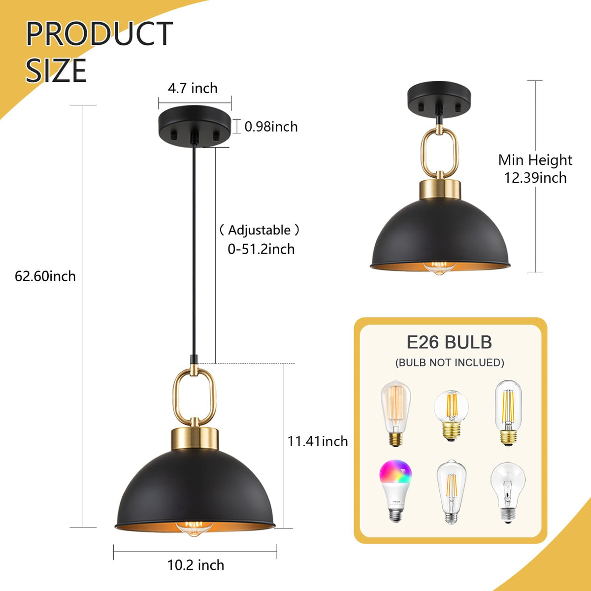 Space-Saving & Adjustable Height: With a 10.2-inch diameter and 6-inch height dome shade, along with a 51-inch adjustable hanging cord, this fixture accommodates various ceiling heights. Customize the drop from 12.6 inches to 63 inches for optimal lighting in your space.