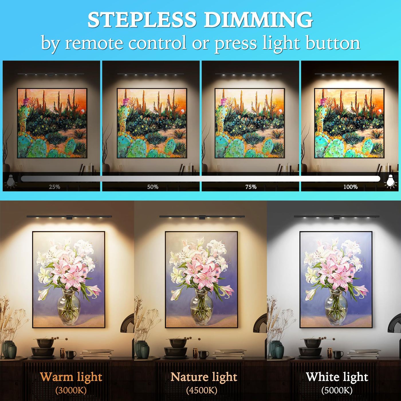 Q: What are the lighting options available with this picture light?A: This picture light offers three different lighting colors: warm light (3000K), natural light (4500K), and cool light (5000K). You can also dim the brightness from 100% to 10% using the remote control or touch control.
