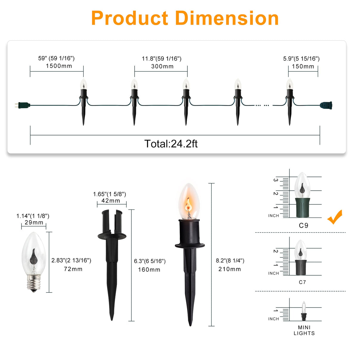 SPECIFICATIONS: Bulb type: C9 flicker bulbs Bulb spacing: 12 inches Lead cord: 59 inches End cord length: 6 inches Max connectable strands: up to 20 strands Bulb wattage: 1W Bulb holder model: E17 Lighting color: Flicking flame