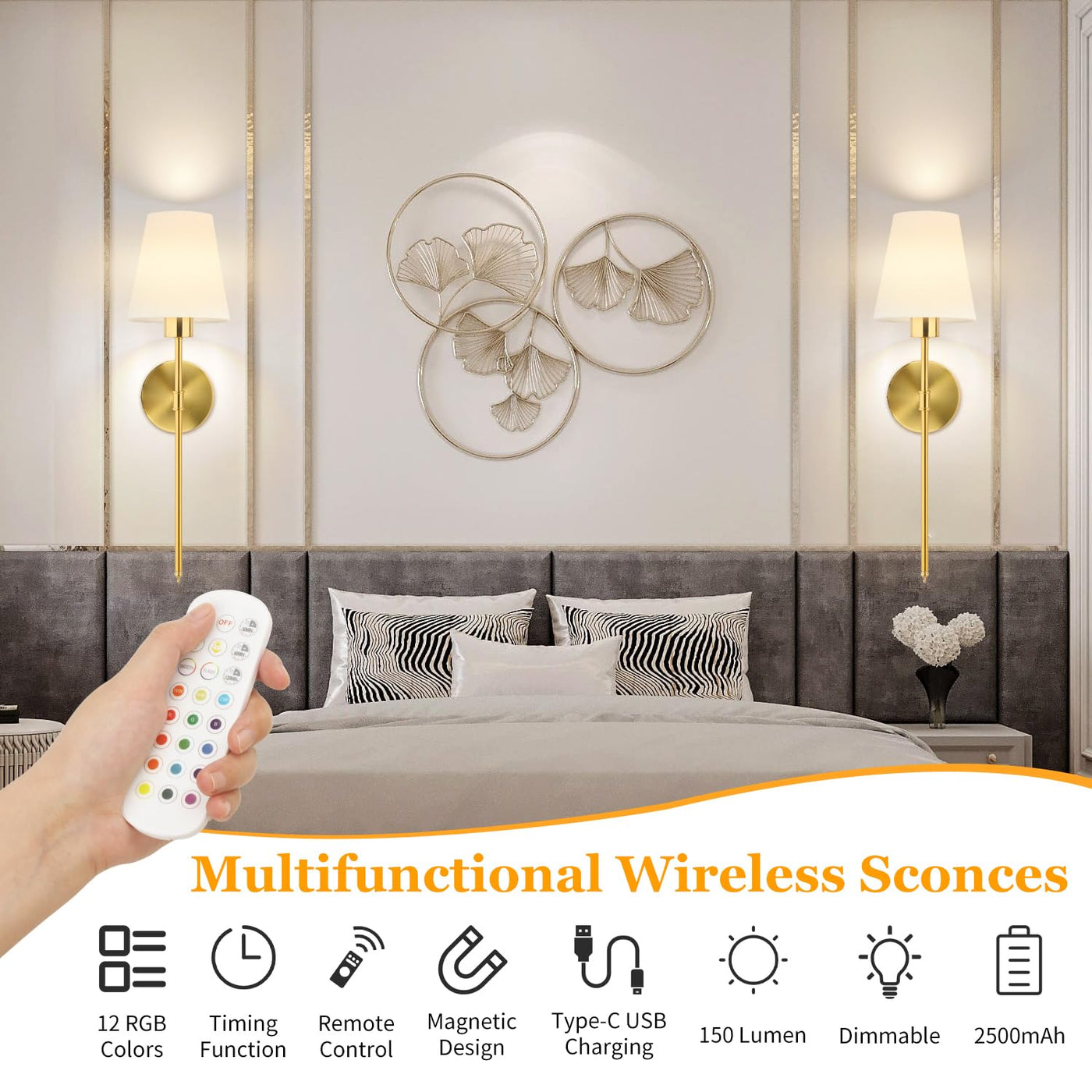Tislyco Battery Operated Wall Sconces Set Of 2, Gold Rechargeable Wall Lamps With 2500Mah Magnet Detachable Dimmable Remote Bulb
