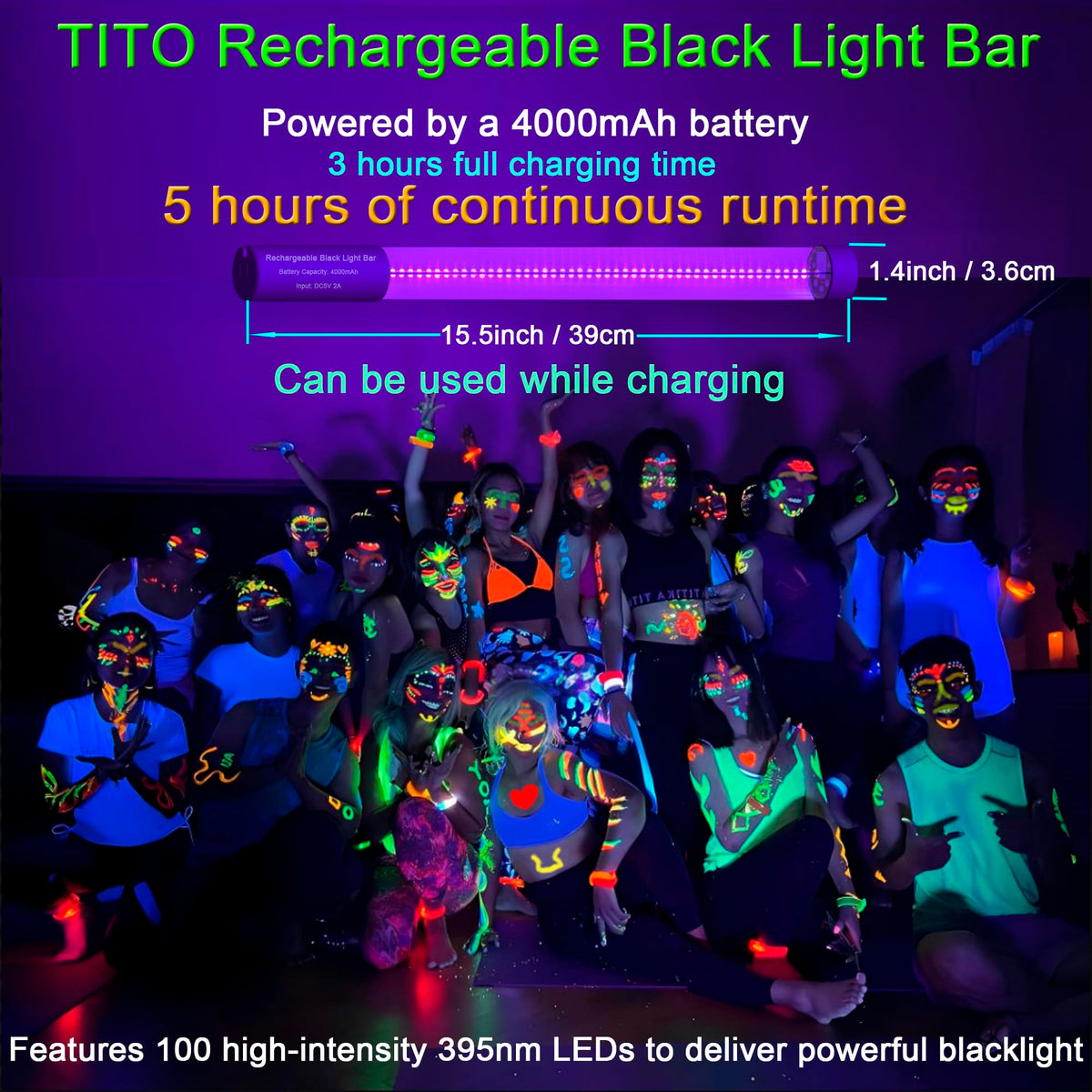 Q: What types of activities is the TITO Black Light Bar suitable for?A: The TITO Black Light Bar is ideal for a variety of activities, including Halloween parties, body painting, aquarium lighting, night fishing, and detecting pet urine.