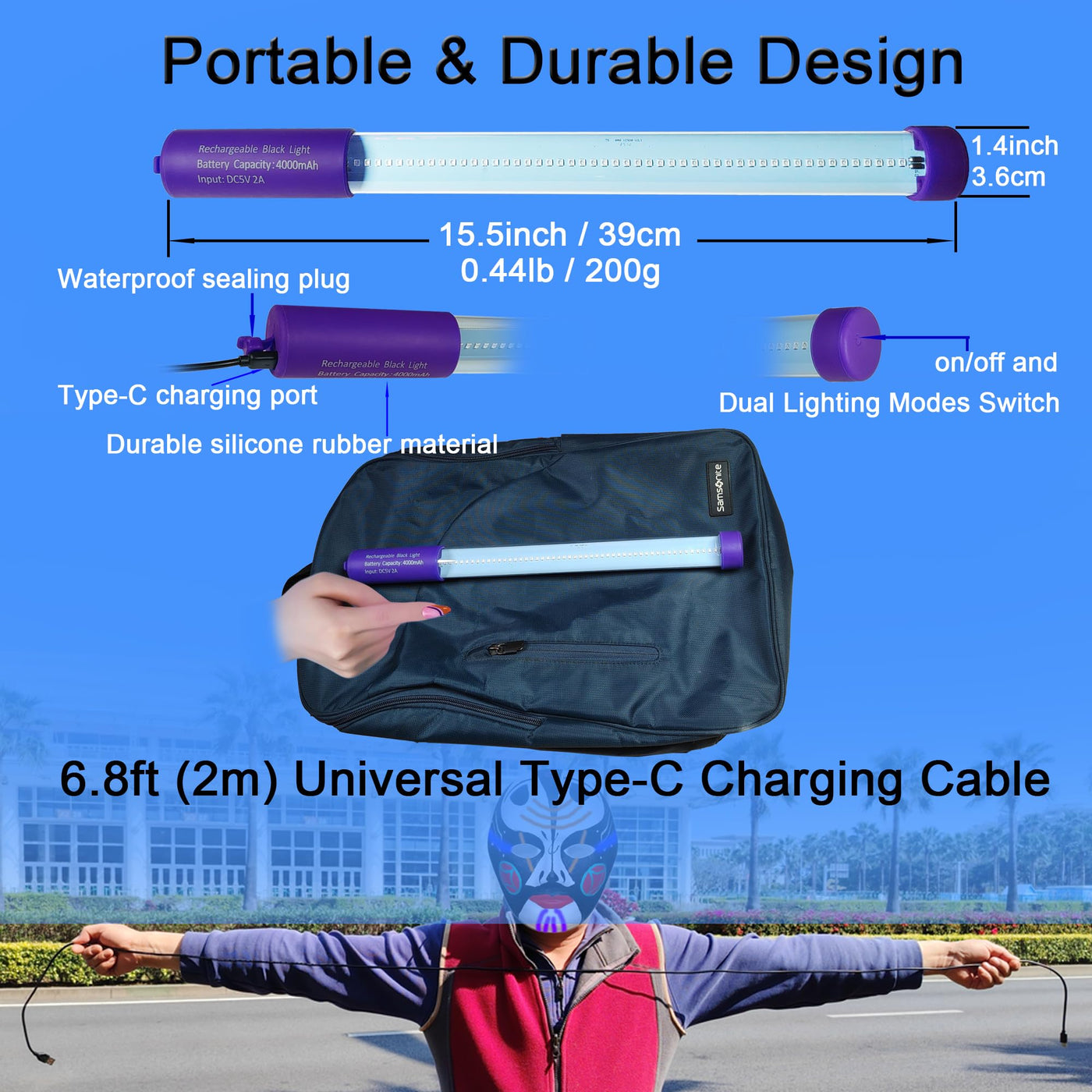 Constructed from durable polycarbonate material, this black light bar is both waterproof and shatterproof, ensuring it withstands various environments. Featuring a sleek, portable design, it is lightweight and easy to handle, making it perfect for on-the-go applications. The device is powered by a robust 4000mAh rechargeable battery, enabling up to 5 hours of continuous runtime after a full charge of approximately 3 hours. With dual lighting modes, you can choose between a Single-Side 180? Beam for focused lighting and a Dual-Side 360? Beam for broader coverage. This flexibility makes it suitable for a wide range of uses, from illuminating uranium glass antiques to providing ambient lighting for events.