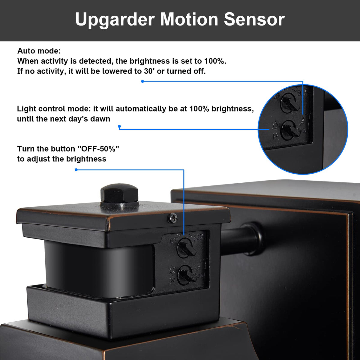 Q: How does the motion sensor mode work on this outdoor light fixture?A: The upgraded motion sensor mode activates when set to 'Auto.' It detects human activity, blinking a red light five times before switching to high brightness. After 120 seconds of no detected movement, it automatically lowers to low brightness, enhancing energy efficiency.