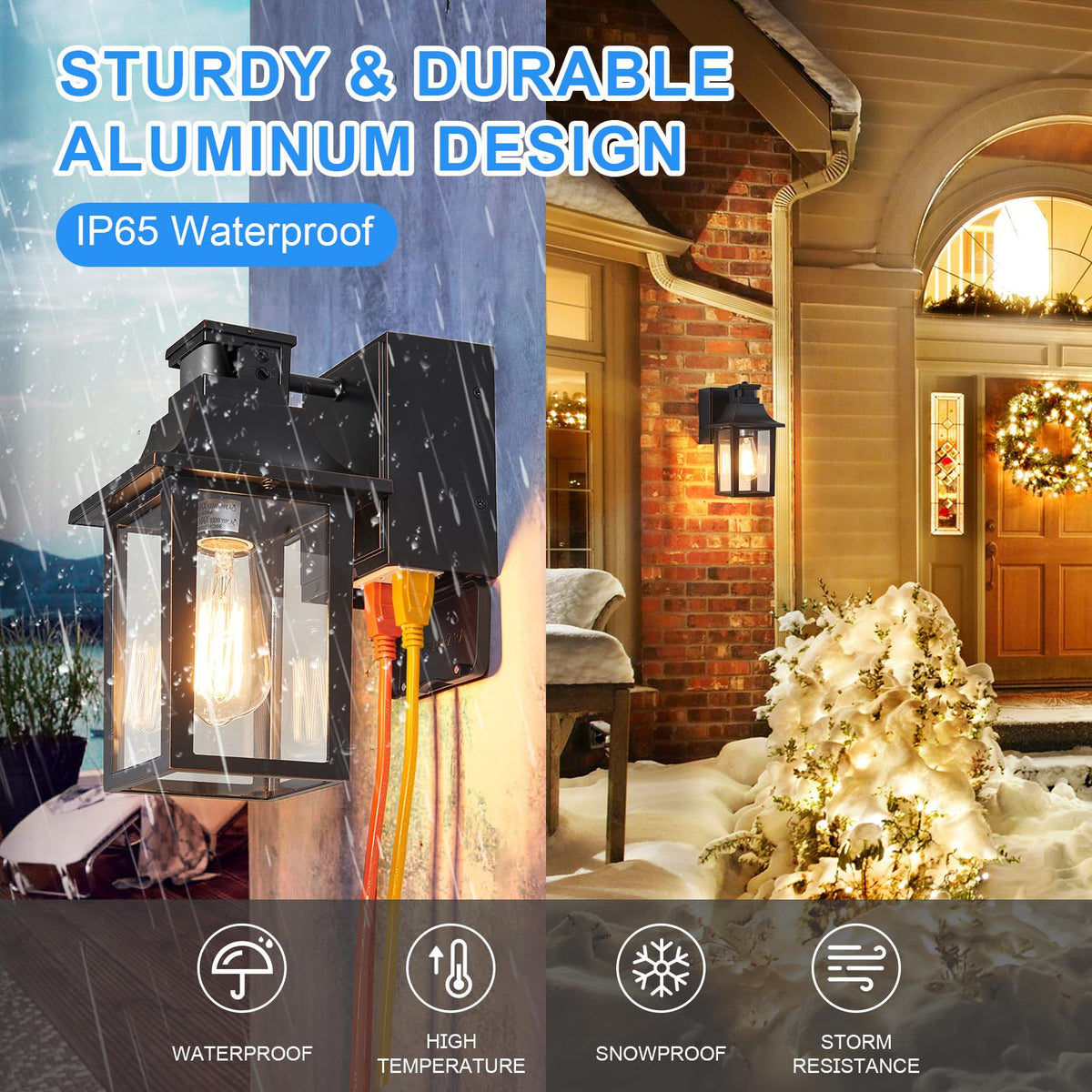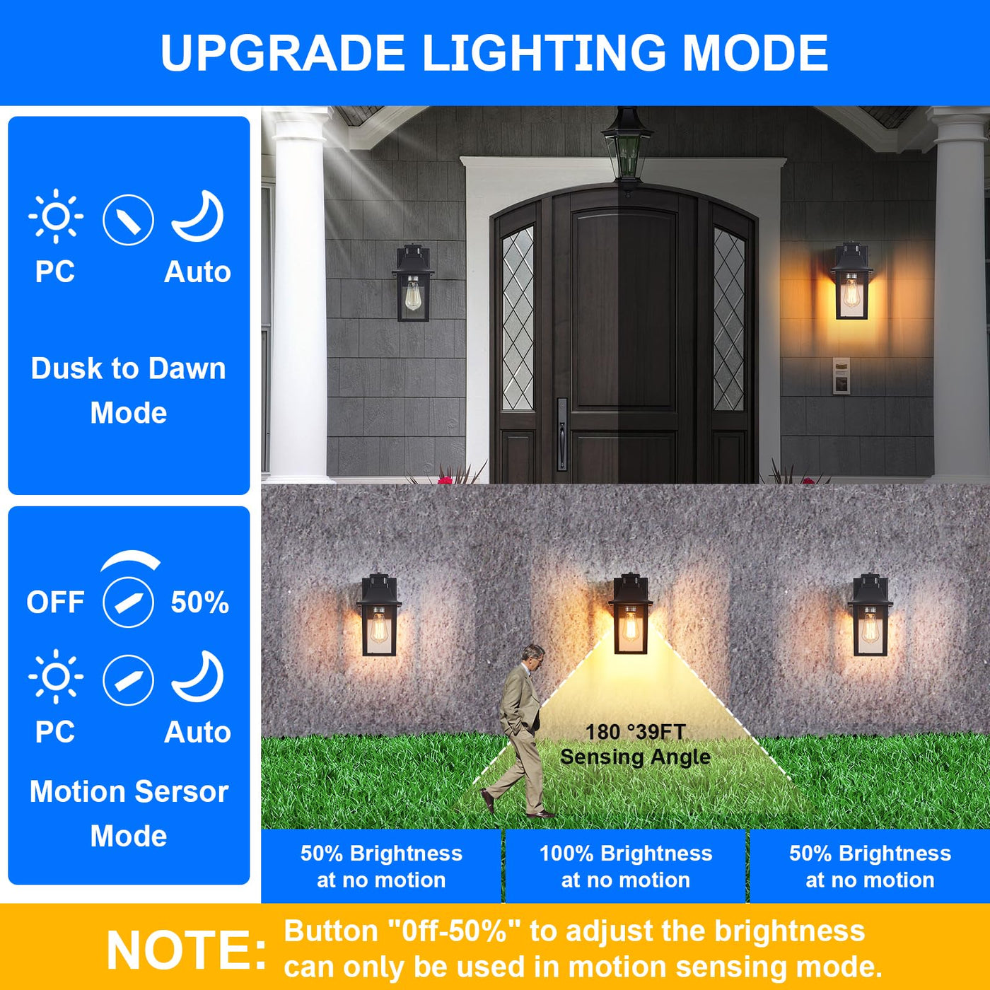 This porch lights outdoor fixture comes with two built-in GFCI outlets that provide safe power access and protection from surges, shorts and faults. It features rain-protected downward-facing outlets with a maximum power of 1080W, perfect for gardening, party decorations, and security monitoring. porch light features an upgraded Motion Sensor Mode, which automatically switches to High Brightness Mode when human activity is detected, and then lowers to Low Brightness after 120 seconds of inactivity. In addition, a light-sensing mode keeps the light on at night. The fixture is made of corrosion-resistant aluminum and tempered glass to withstand all types of weather and is compatible with LED or incandescent bulbs (up to 60W) in a standard E26 base. Easy to install, comes with all required hardware and instructions, reset the socket by pressing the “RESET” button after installation, if you have any questions feel free to contact customer service.