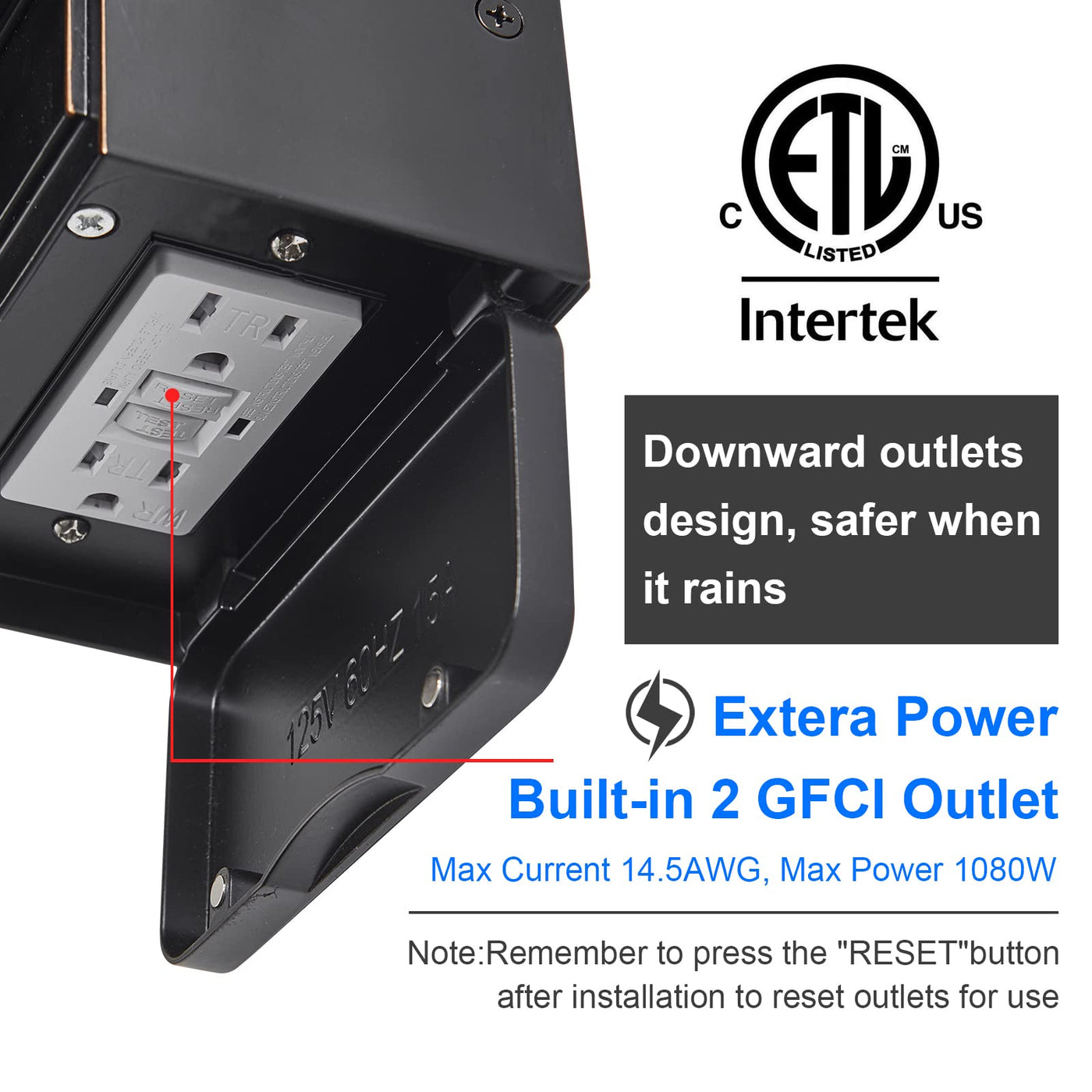 Q: What applications can I use the GFCI outlet for?A: The built-in GFCI outlet is perfect for powering outdoor devices such as party decorations, gardening tools, security cameras, and more. It ensures safety by protecting against surges, short circuits, and faults, making outdoor power use convenient and secure.