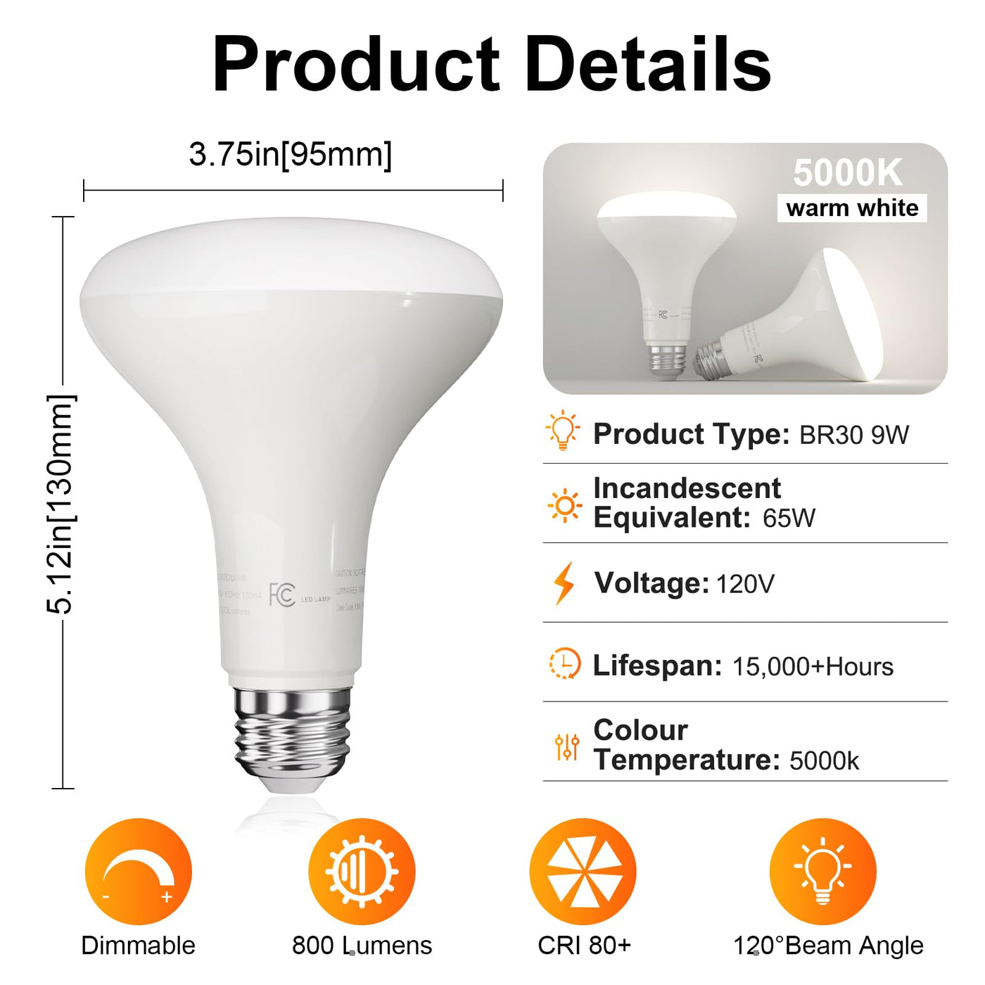 Tjoy 12 Pack Br30 Led Bulb 65W Equivalent, Dimmable Flood Light Bulbs Indoor, E26 Base, 5000K Daylight, 9W, 800 Lm, Recessed Lighting Bulbs For Ceiling, Recessed Can, Living Room And Kitchen