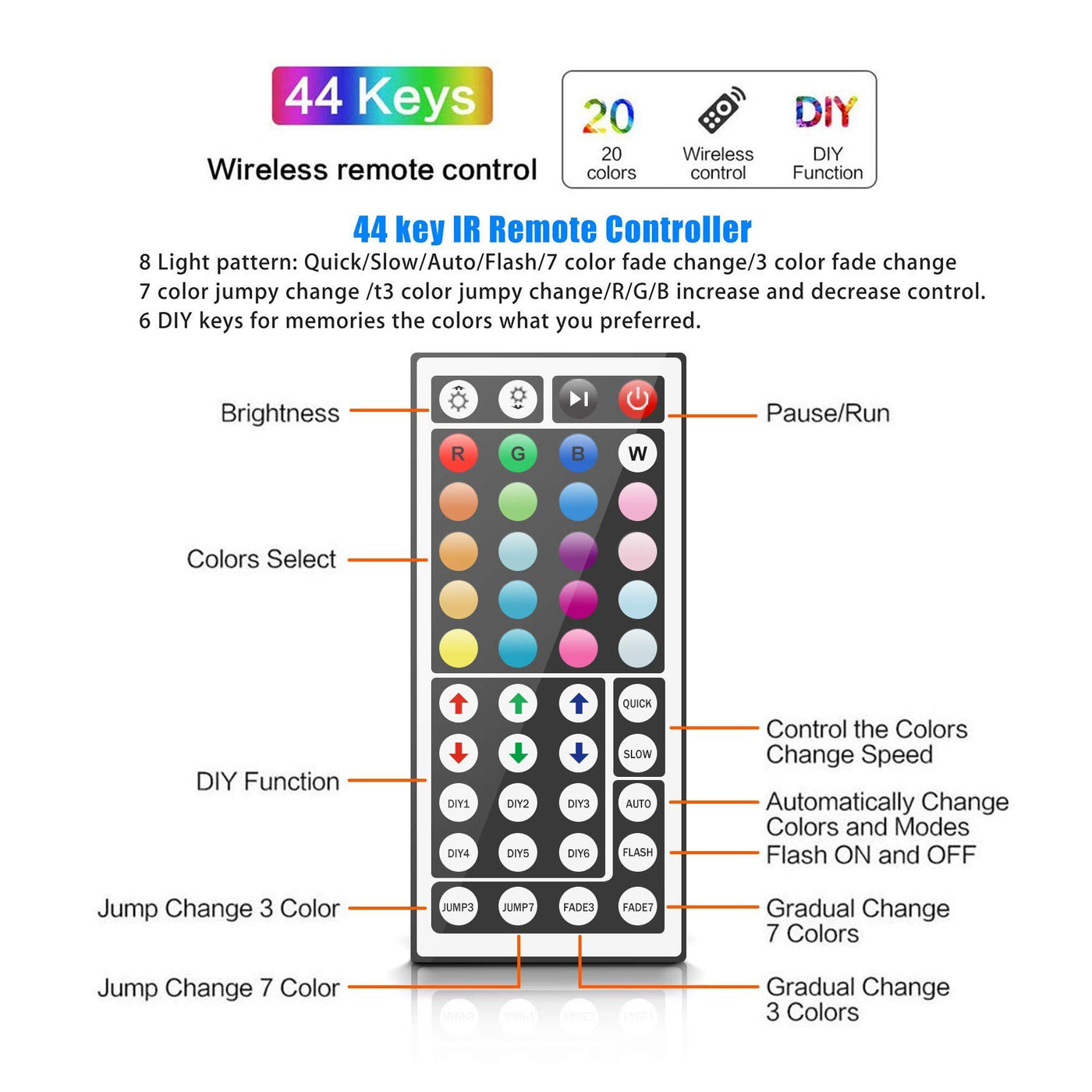 Q: How do I control the TJOY LED Strip Lights?A: The lights come with a forty-four key IR remote control that allows you to select from twenty preset colors, six DIY color options, and eight dynamic function keys.
