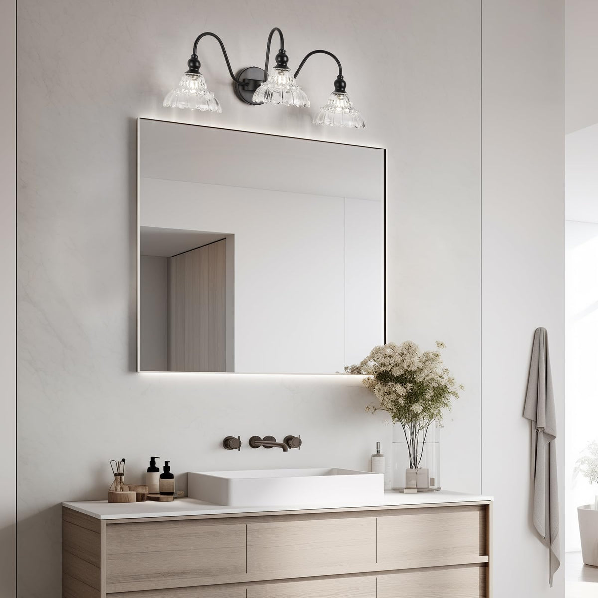 Q: What materials are used in the TLOLGT Modern Antique Bathroom Vanity Light Fixtures?A: The TLOLGT Modern Antique Bathroom Vanity Light Fixtures are made from a combination of metal with a black painted finish and glass shades, providing both durability and aesthetic appeal.