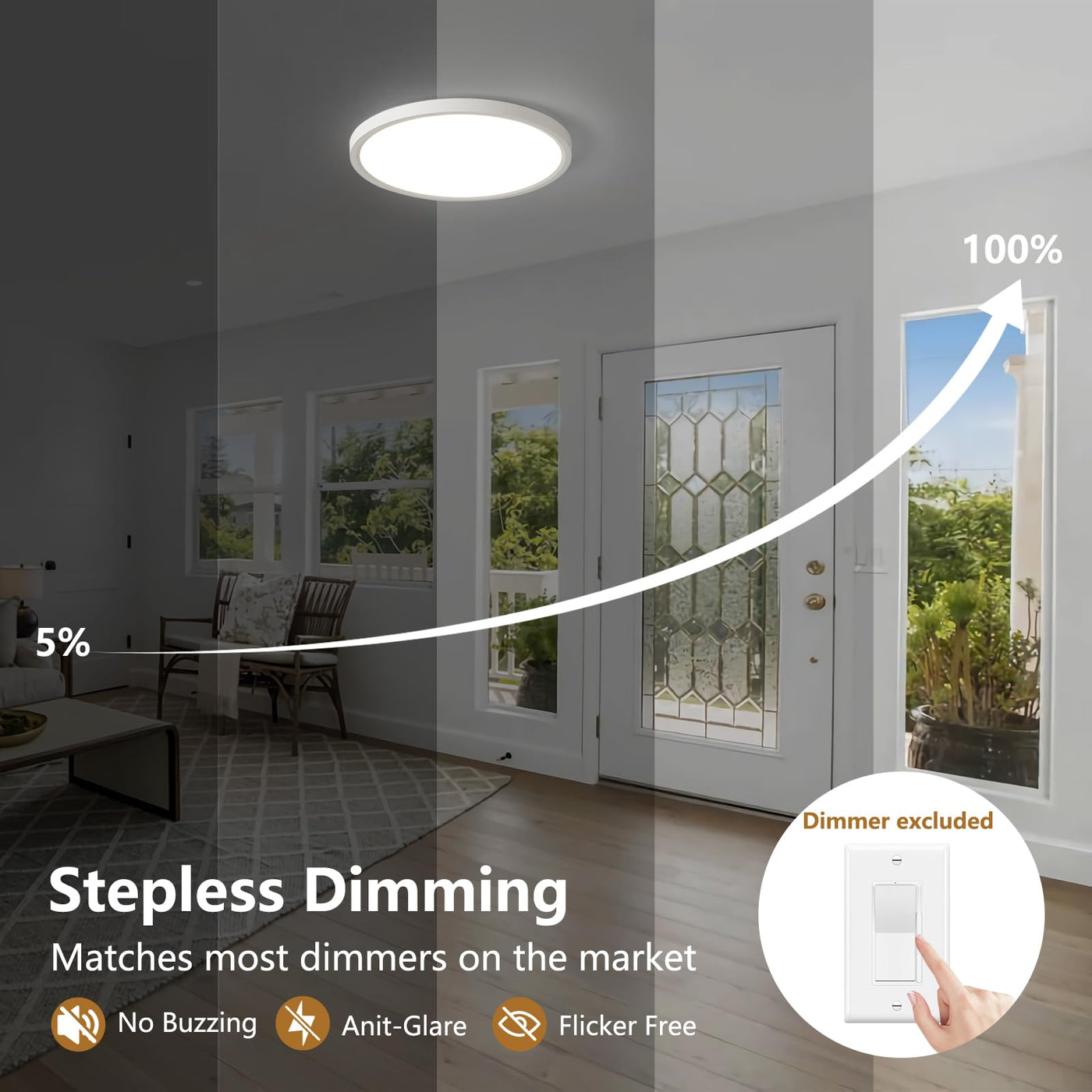 Brightness Dimmable: Adjust brightness steplessly from 5% to 100% to meet your lighting needs.