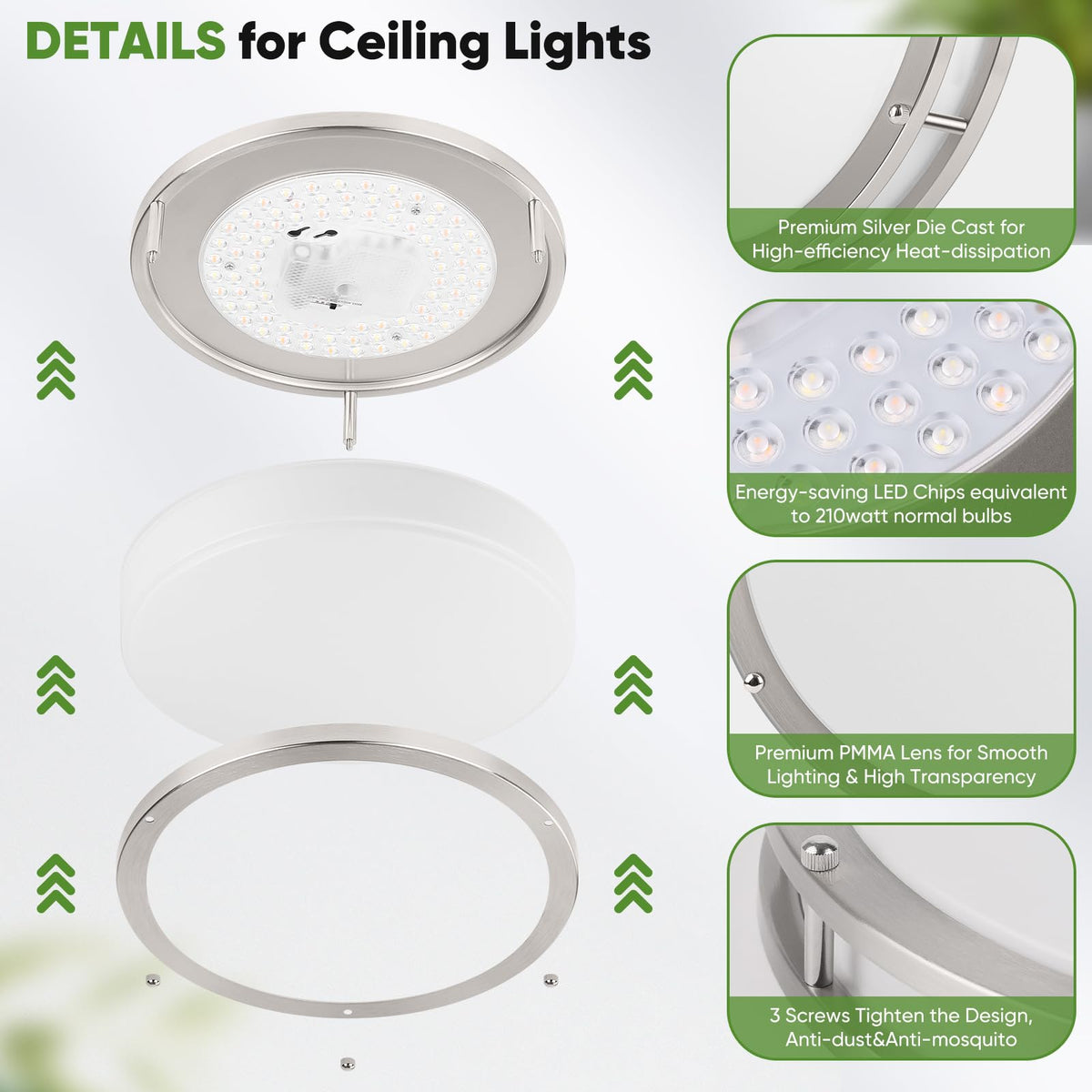 Crafted from well-made brushed nickel and durable plastic, this ceiling light features a sleek matte finish and a milk white cover that blends seamlessly with contemporary decor. The fixtures compact size, with a diameter of 10 inches and a thickness of 2.67 inches, ensures it maintains a low profile while providing ample illumination. The embedded SMD LEDs offer high efficiency, delivering a bright output of 3600 lumens at a low energy consumption of just 30 watts. This means significant energy savings compared to traditional incandescent bulbs.