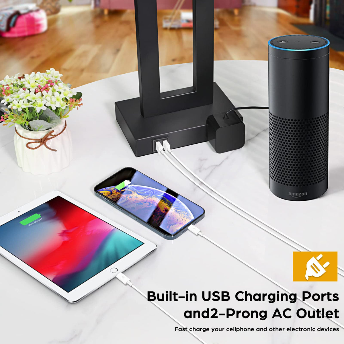 - **Dual USB Charging Ports & AC Outlet**: Equipped with two 5V/2.1A USB ports and a standard AC outlet, these lamps allow you to charge your devices conveniently at your bedside or desk without the hassle of searching for additional sockets.