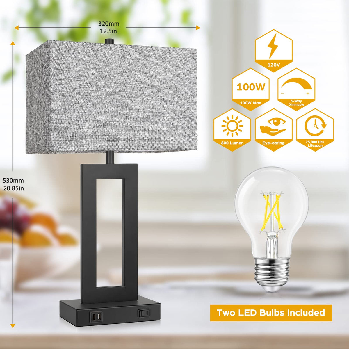 Q: What type of bulbs are included with the TOBUSA table lamps, and what are their specifications?A: The set includes two A19 LED Edison bulbs, which provide bright white light at 5000K and 800 lumens while consuming only 7 watts of energy. This makes them an energy-efficient choice for illuminating your space.