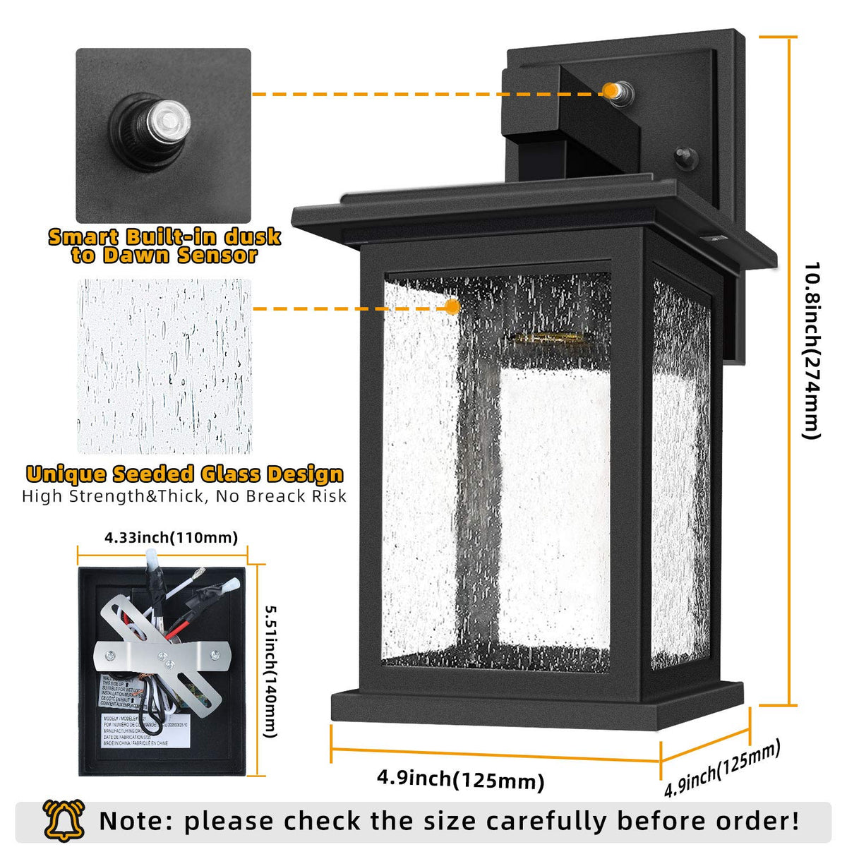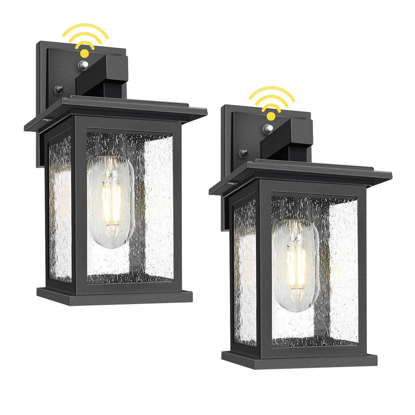 Tobusa 2-Pack Outdoor Wall Lanterns, Dusk To Dawn Sensor, Waterproof Black Sconce, Seeded Glass