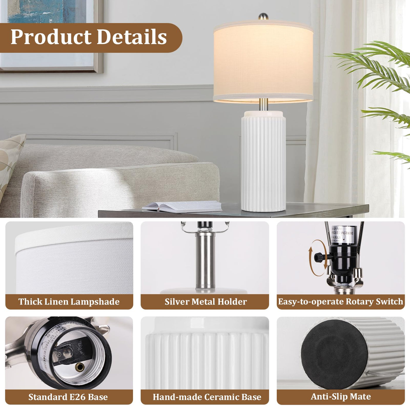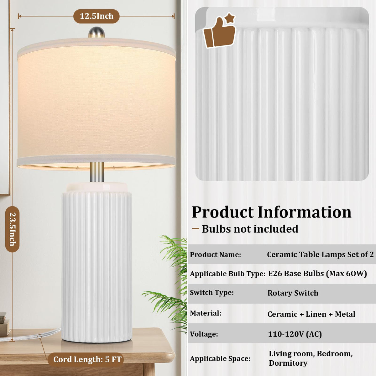Tobusa Together New Ideas And Advanced Technologies, We Have Been Designed And Manufactured Decorative&Functional Lighting For International Market For 10+ Years, And Remain As Close To Our Core Values As We Ever Have: Premium Materials, Updated Function, Unique Design. Specification: Product Name: Modern Ceramic Table Lamps Set Of 2 Color:Cream/White/Green/Blue Available Size:23.5L * 12.5W Inch Cord Length: 5Ft Detail: -Thick Lampshade: The Ceramic Table Lamps Use A Decent White Linen Lampshade. It Ensures That The Light Is Evenly And Gently Distributed To Protect Your Eyes When Reading And Working. -Handcraft Ceramic Lamp Body: This Set Of 2 Lamps Match A Variety Of Furniture Styles From Antique To Contemporary, Making It A Versatile Choice For Any Room In Your Home. The Classic Color Brings You A Calm Mood. -Heavy Lamp Base: The Ceramic Lamp Body Is Sturdy And Wear-Resistant, Providing A Solid Foundation For The Lamp. The Stylish Vertical Stripes Design Makes Your Room Look More Refined. Ensure A Long Service Life And Strong Ornamental Value. -Safe Non-Slip Base: With A Simple Rotary Switch And A Non-Slip Base, You Don'T Have To Worry About It Falling At Any Time Or Hurting The Children At Home. Tobusas Ceramic Table Lamps Have Safety And Quality Control With Every Purchase You Make. More Reasons You May Love This Lamp: Tobusas Farmhouse Ceramic Table Lamps Will Be A Wonderful Addition To Home And Are Suitable For Spaces Of Various Styles. The Table Lamps With A Ceramic Base Creates An Atmosphere Of Rustic Elegance. It Features A Creative White-Colored Finish, Creating A Natural Look, And Can Be Easily Matched With Your Furniture. The Bedside Table Lamps Are Very Suitable For The Living Room And Bedroom And Apply To A Variety Of Interior Decorations. -Lamp Decor For Bedroom: The Modern Ceramic Table Lamps Serve As Both A Warm Night Lamp And A Stylish Ornament -Functional And Decorative Ceramic Lamps Set Of 2: Meet Your Lighting Needs And Create A Warm, Comfortable, And Pleasant Feeling For Your Side Table Lamp -Always A Perfect Gift For Your New Home, Or Holiday Gift For Families And Friends Product Contained: -2 X Lampshades -2 X Lamp Bases -2 X Harps -4 X Lampshade Rings -1 X User Manual We Have Professional Department To Ensure The Within 12 Hrs Problem Resolution To Let Every Customer Choose Our Product With No Risk!