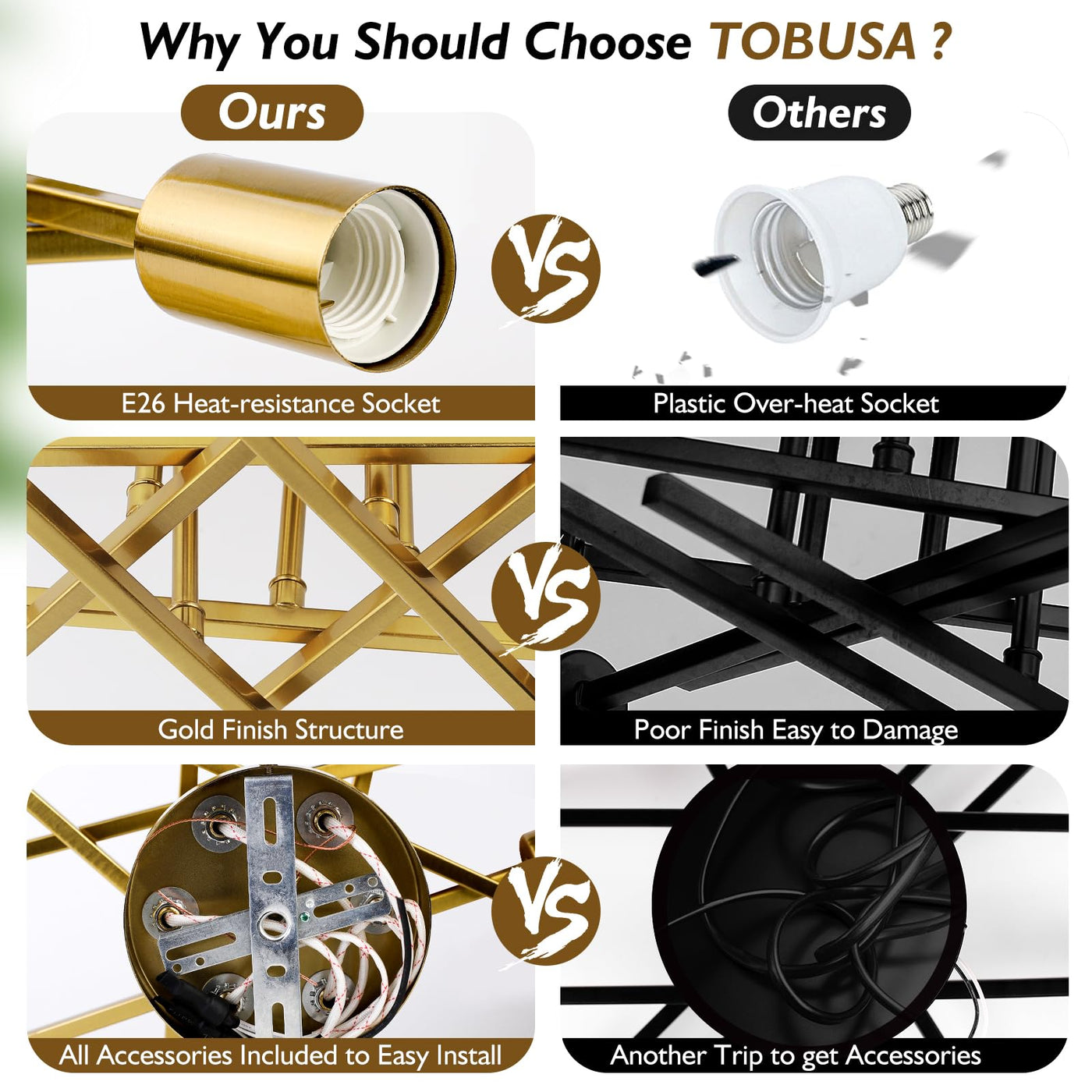 Q: What materials are used in the TOBUSA 6-Light Gold Ceiling Light?A: This ceiling light is made from premium anti-oxidant gold metal, ensuring durability and a non-fading finish. Its solid construction enhances long-term usage and makes it easy to clean.
