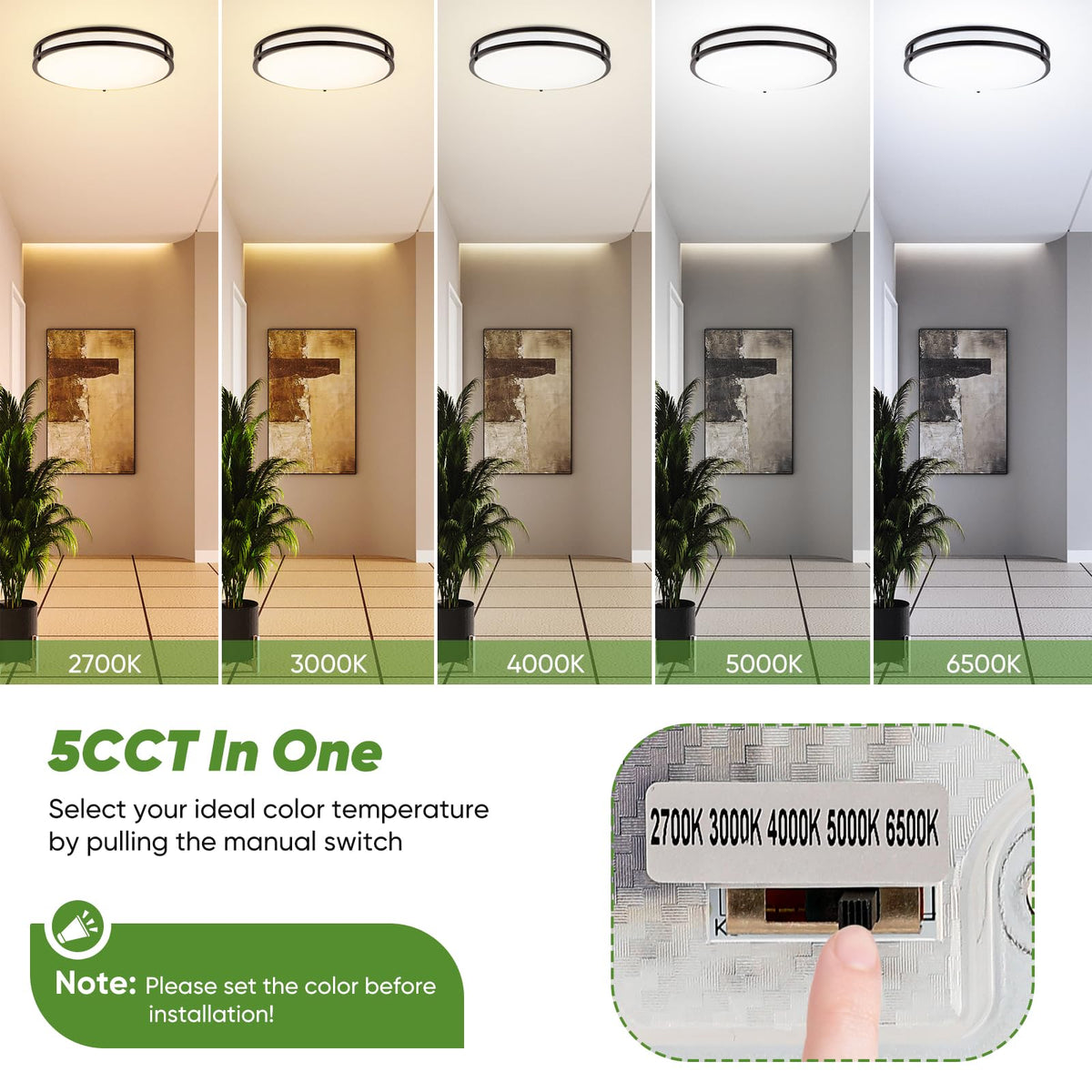 Q: How do I adjust the color temperature on these ceiling lights?A: You can adjust the color temperature by using the easy-operated switch located inside the fixture. The lights offer five color temperature options ranging from 2700K to 6500K.