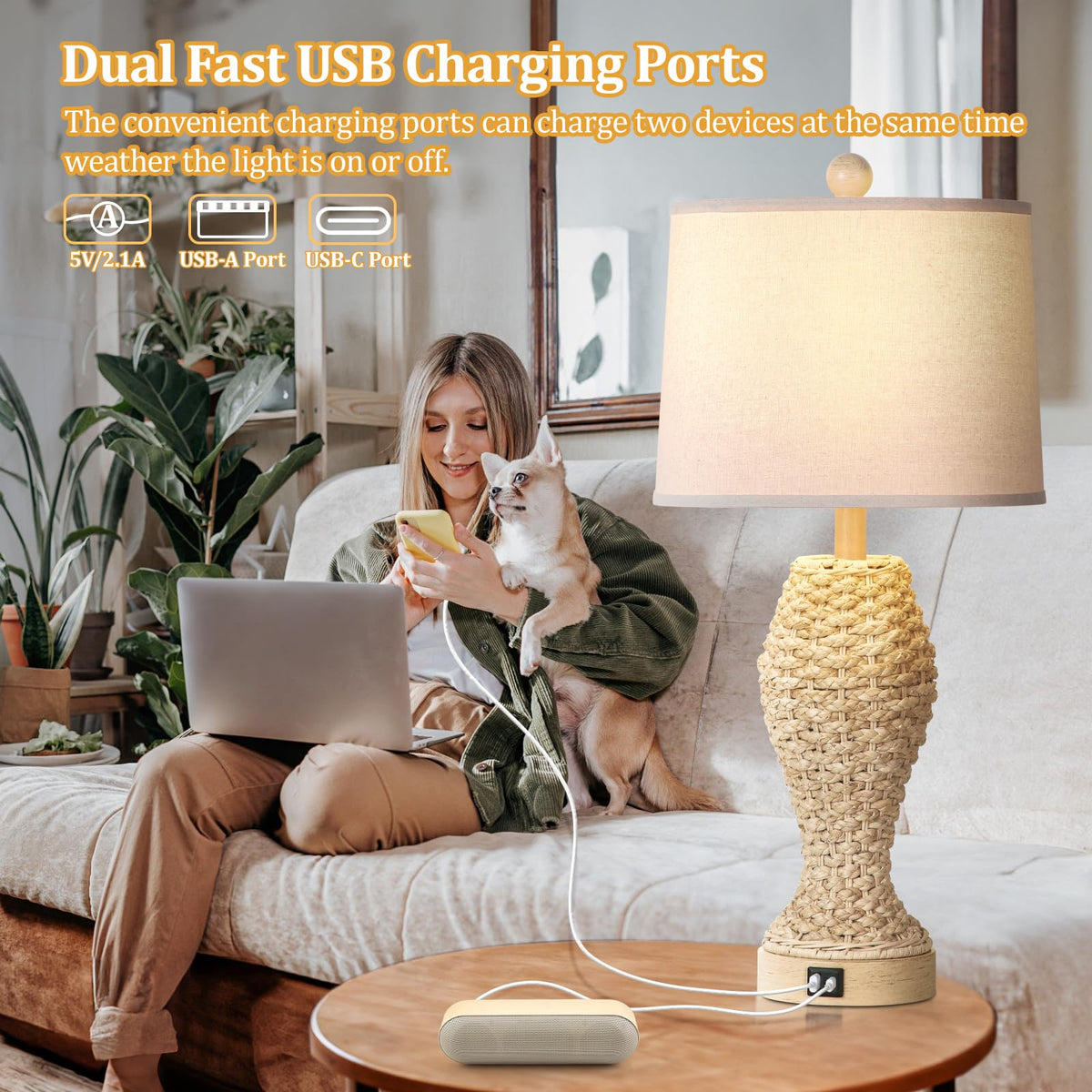 Coastal Seagrass Living Room Table Lamps set of 2 with USB C+A (2 E26 LED Bulb Included)