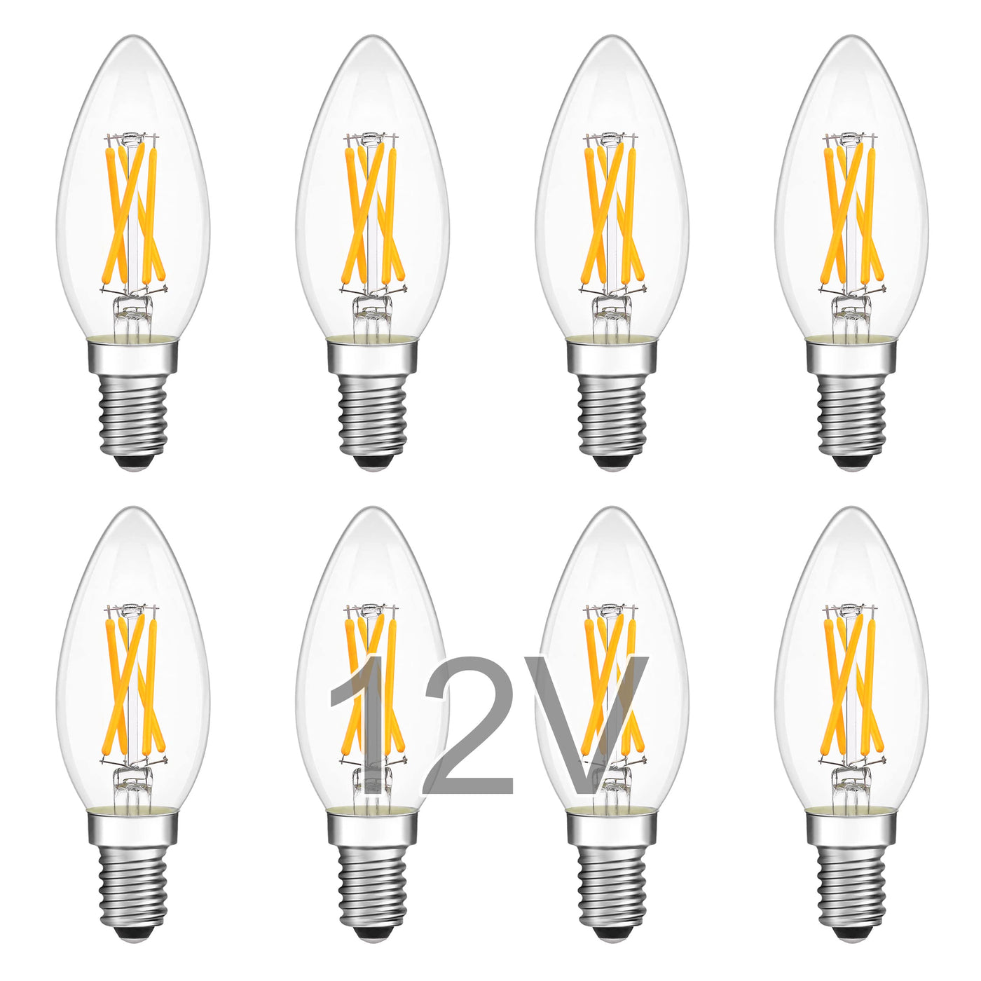 TOKCON 4W E12 Candelabra Base 12Volt LED Candle Light Bulb to replace 40W traditional Halogen/ Incandescent Bulb Note: ??Only work for 12V-24V DC, DO NOT use for 110V-130V. Specification: Voltage: Low Voltage DC 12V-24V Power: 4W(40 Watt Equivalent) Beam angle: 360 Bulb Base: E12 Screw Color Temperature: 2700K Warm White Brightness: 400 Lumens Lifespan: 25,000 hours Features: -High Bright LEDs, 4W 400lm bright enough to replace 40W halogen/Incandescent Bulb -High CRI, 85Ra to create a healthy and real visual -No Flicker or UV/ IR, No noise, soft warm white color, protect your eyes and offer comfortable lighting -Easy To Install, screw into your 12V lamp, auto adapt the positive and negative pole of DC wiring -All-Round Safety, including fire resistance and short-circuit protection to give you peace of mind while you power on Applications: Works for any 12Volt low voltage fixtures for 12V project, off-grid cabins, pathway rope light, lamppost, solar powered greenhouse, shed, barn lights, 12V work lamp, cordless lamps, garage and yard lamp, backup lighting in shop, battery backup power, boat, outdoor gazebo, landscape, RV, camper, marine, outdoor pillar light fixtures, light strings with E12 sockets. If you have any issues please contact us via e-mail, we'll respond within 24 hours to make it right.