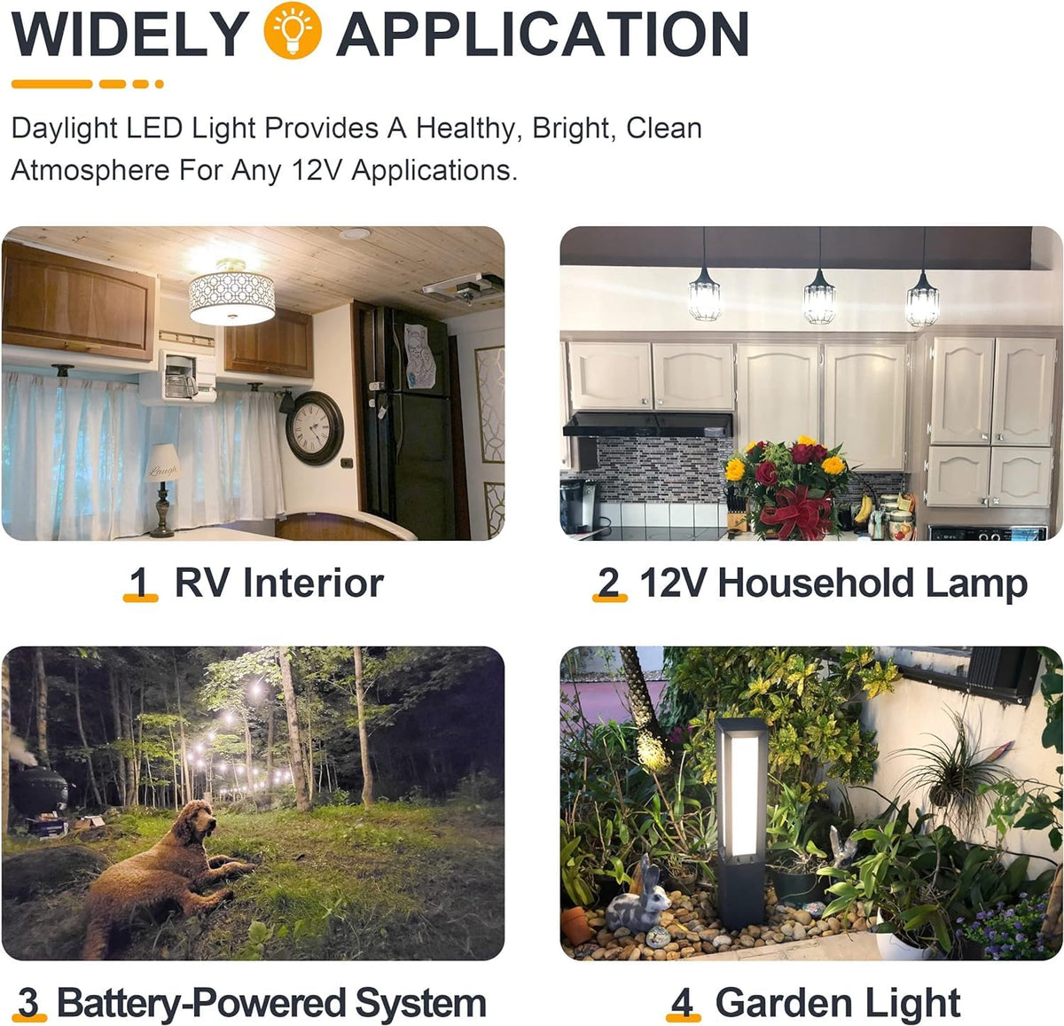TOKCON 4W E12 Candelabra Screw Base 12Volt LED Tubular Bulb to replace 40W traditional Halogen/ Incandescent Bulb Note: ??Only work for 12V-24V DC, DO NOT use for 110V-130V. Specification: Voltage: Low Voltage DC 12V-24V Power: 4W(40 Watt Equivalent) Beam angle: 360 Bulb Base: E12 Candelabra Screw Color Temperature: 5000K Daylight White Brightness: 400 Lumens Lifespan: 25,000 hours Features: -High Bright LEDs, 4W 400lm bright enough to replace 40W halogen/Incandescent Bulb -High CRI, 85Ra to create a healthy and real visual -No Flicker or UV/ IR, No noise, daylight white color, protect your eyes and offer comfortable lighting -Easy To Install, screw into your 12V lamp, auto adapt the positive and negative pole of DC wiring -All-Round Safety, including fire resistance and short-circuit protection to give you peace of mind while you power on Applications: Works for any 12Volt low voltage fixtures for 12V project, off-grid cabins, pathway rope light, lamppost, solar powered greenhouse, shed, barn lights, 12V work lamp, cordless lamps, garage and yard lamp, backup lighting in shop, battery backup power, boat, outdoor gazebo, landscape, RV, camper, marine, outdoor pillar light fixtures, light strings with E12 sockets. If you have any issues please contact us via e-mail, we'll respond within 24 hours to make it right.