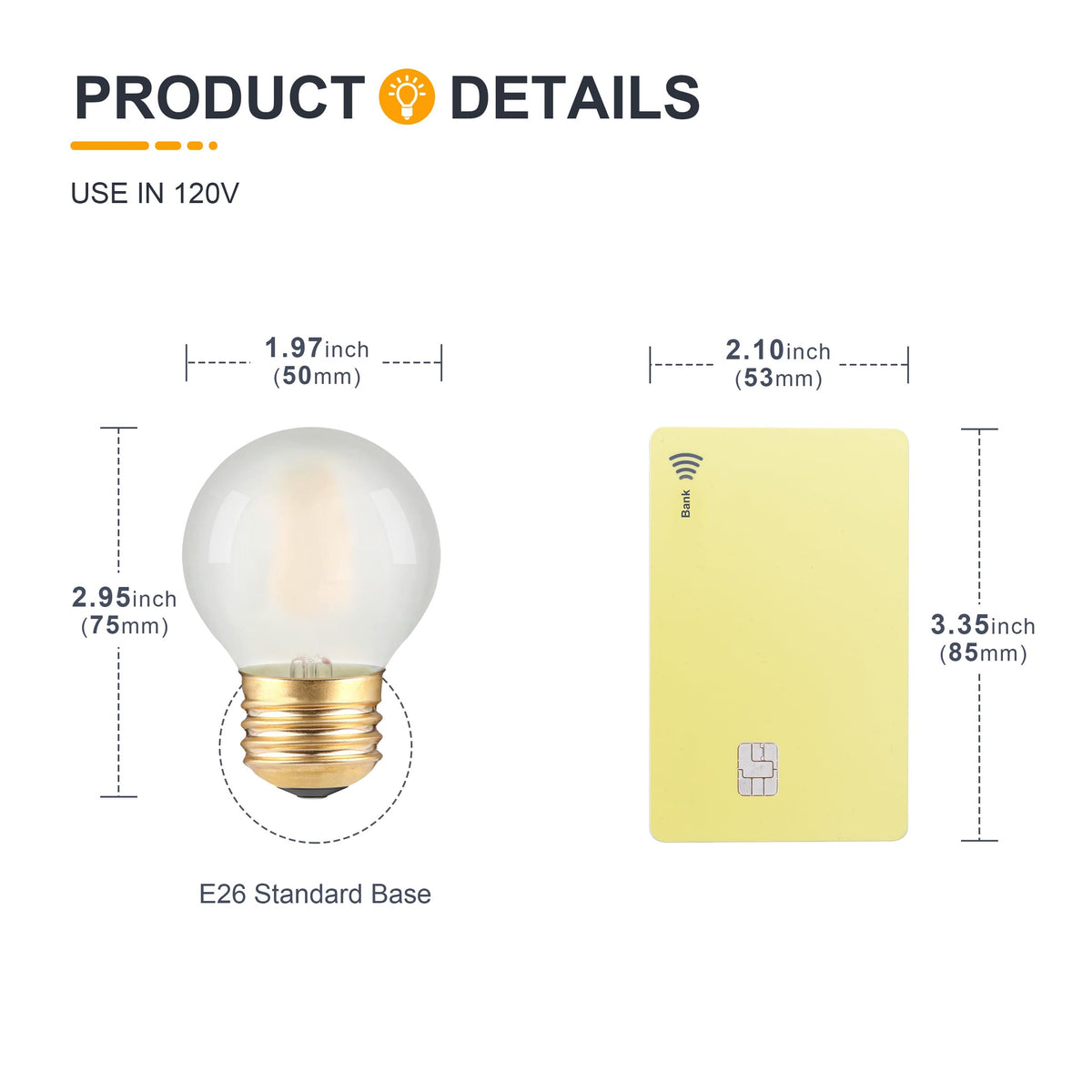 Q: What type of base do these bulbs have?A: The Dimmable Globe Frosted A15 LED Bulbs feature an E26 screw base, making them compatible with most standard light fixtures.