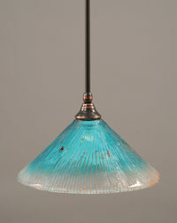 The Toltech Lighting 23-BC-448 Stem Mini-Pendant Light Black Copper Finish with Teal Crystal Glass, 10-Inch is a ceiling light that features a 12-Inch teal crystal glass shade. comes with 1-6-Inch, 2-12-Inch and 1-18-Inch stem sections. Product dimensions (in Inch): 8 H by 12 W. Fixture requires 1 100-Watt medium base incandescent bulb, not included. Product safety tested and approved by the UL/CUL in the US and Canada. Assembly required. This model is also available in the following finishes: Brushed Nickel, Bronze.