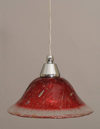 Q: What materials are used in the construction of this pendant light?A: This pendant light features a chrome finish and is made from steel, while the shade is crafted from raspberry crystal glass, providing both durability and aesthetic appeal.