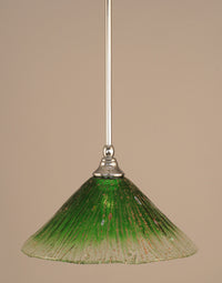 Q: What material is the Toltec Lighting Mini Pendant made of?A: The pendant features a chrome finish and is constructed from steel, while the shade is made of kiwi green crystal glass, offering a stylish contrast.