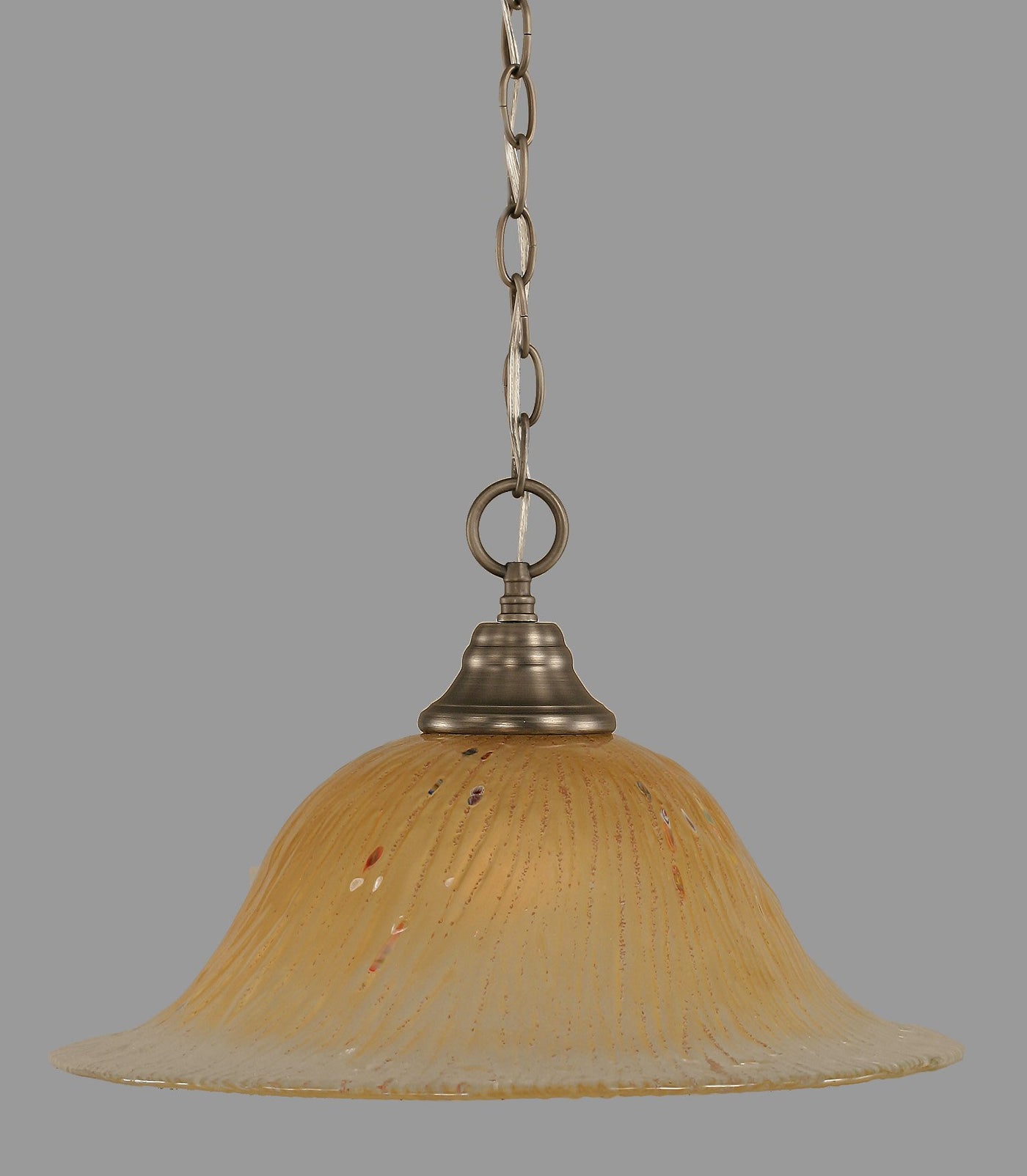 Q: What materials are used in the construction of the pendant light?A: The Toltec Lighting 1 Light Pendant is constructed from steel, and it features an amber crystal glass shade that enhances its overall aesthetic.