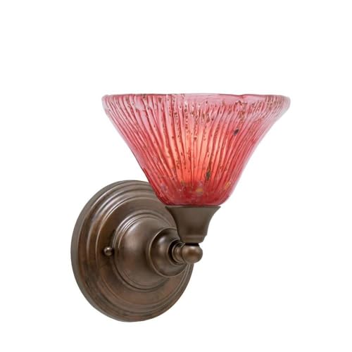 Q: How do I care for and maintain the Toltec Lighting Wall Sconce?A: To maintain the Toltec Lighting Wall Sconce, gently clean the bronze finish and raspberry crystal glass with a soft, dry cloth. Avoid using harsh chemicals or abrasive materials that could damage the finish.