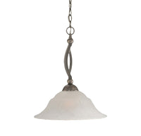 The Toltec Lighting 271-BN-53615 Bow One-Light Down light Pendant Brushed Nickel Finish with White Marble Glass, 16-Inch is a ceiling light that features a 16-Inch white marble glass shade. This chain hung fixture comes with 10-Feet of chain and 11-Feet of wire. Product dimensions (in Inch): 19.25 H by 16 W. Fixture requires 1 150-Watt medium base incandescent bulb, not included. Product safety tested and approved by the UL/CUL in the US and Canada. Assembly required. This model is also available in the following finishes: Black Copper, Bronze.