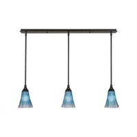36-BRZ-725 3 Light Linear Pendalier With Hang Straight Swivels Shown In Bronze Finish With 5.5" Teal Crystal Glass. Rated for: Dry location. Light Bulb Data: 3 Medium 100 watt. Bulb included: No.