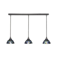 36-BN-9955 3 Light Linear Pendalier With Hang Straight Swivels Shown In Brushed Nickel Finish With 7" Blue Mosaic Art Glass. Rated for: Dry location. Light Bulb Data: 3 Medium 100 watt. Bulb included: No.