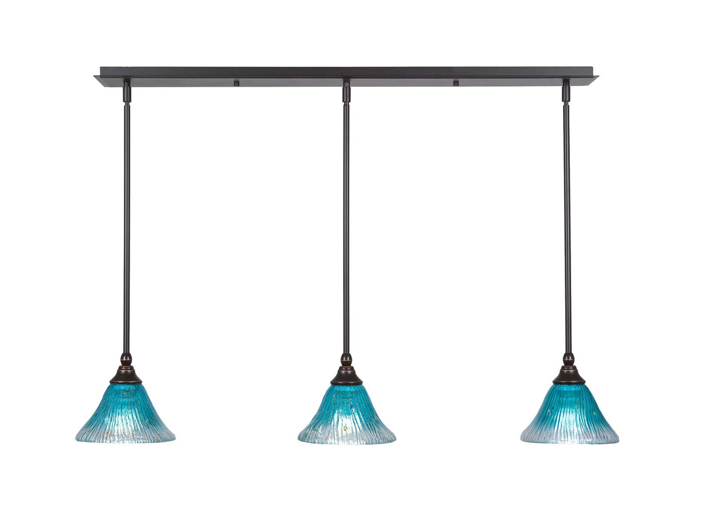 36-DG-458 3 Light Linear Pendalier With Hang Straight Swivels Shown In Dark Granite Finish With 7" Teal Crystal Glass. Rated for: Dry location. Light Bulb Data: 3 Medium 100 watt. Bulb included: No.
