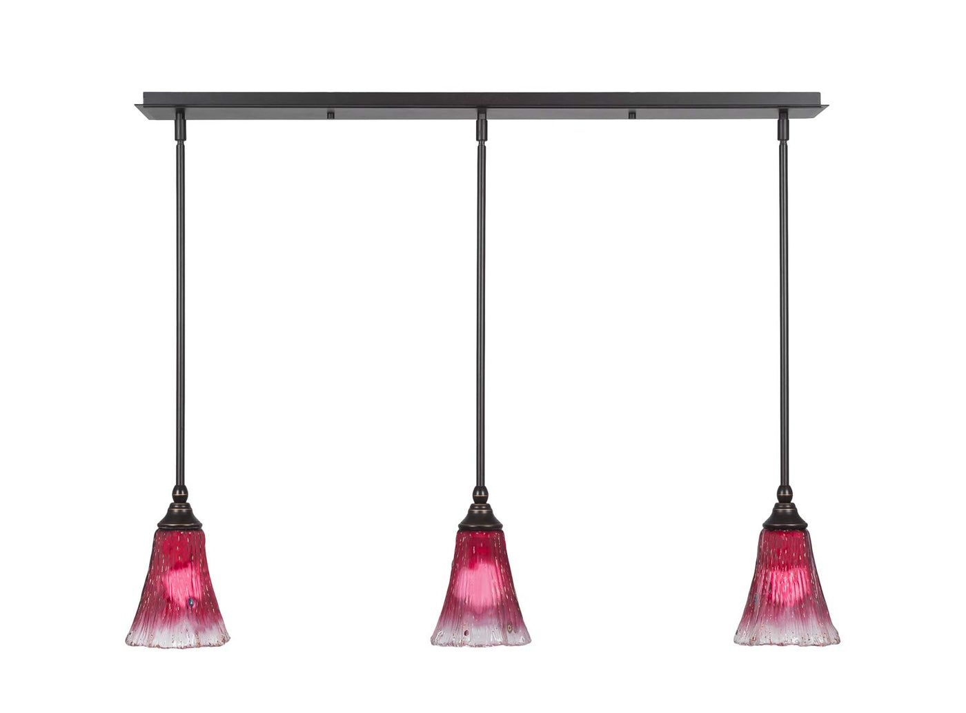 36-DG-726 3 Light Linear Pendalier With Hang Straight Swivels Shown In Dark Granite Finish With 5.5" Raspberry Crystal Glass. Rated for: Dry location. Light Bulb Data: 3 Medium 100 watt. Bulb included: No.