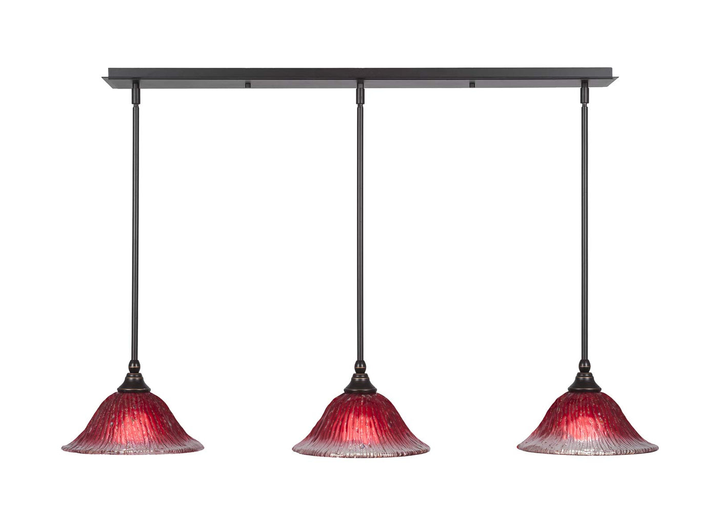 36-DG-736 3 Light Linear Pendalier With Hang Straight Swivels Shown In Dark Granite Finish With 10" Raspberry Crystal Glass. Rated for: Dry location. Light Bulb Data: 3 Medium 100 watt. Bulb included: No.