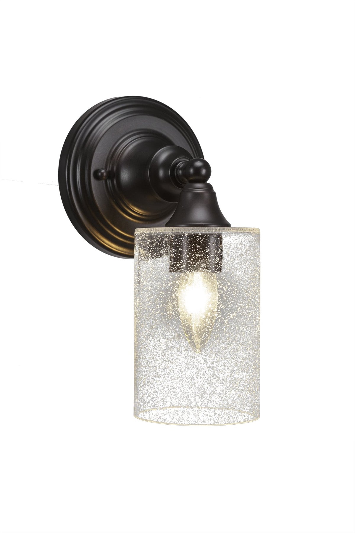 Q: What style of decor does this wall sconce complement?A: The wall sconce features a traditional espresso finish and clear bubble glass that can complement various styles, including traditional, transitional, and contemporary decor.