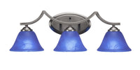 The Zilo 3 Light Bath Bar in dark granite finish with 7-Inch Blue Italian Glass is UL/CUL Listed. Product Dimensions: 8.5-inches deep x 23.75-inches long x 8.25-inches tall. Back plate Dimension: 5.25-inch wide x 9-inch height x 1.25-inch depth. Requires 3 100-Watt medium incandescent bulbs. The beauty of Toltec Lighting's entire product line is the opportunity to create a look all your own. Toltec Lighting now offers over 40 glass shade choices, with most being available as an option on every lighting family, making the variations limitless. It really doesn't matter if a project requires traditional, transitional, or contemporary styling, Toltec Lighting fixtures will fit most any decor.