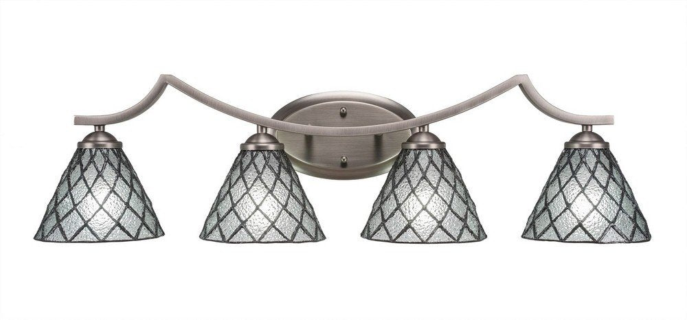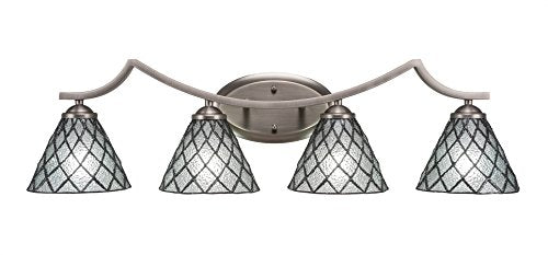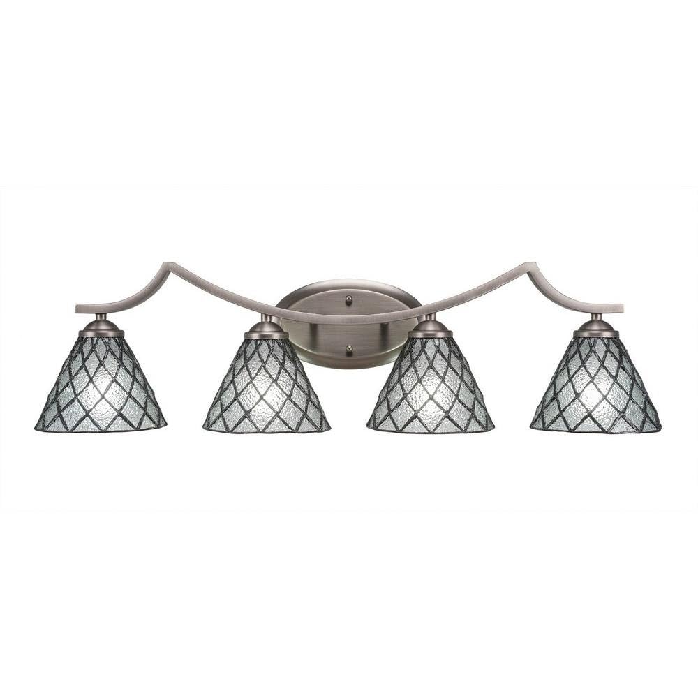 The Zilo 4 Light Bath Bar in Graphite Finish with 7-Inch Diamond Ice Tiffany Glass is UL/CUL Listed. Product Dimensions: 8.5-inches deep x 32.5-inches long x 8.75-inches tall. Back plate Dimension: 5.25-inch wide x 9-inch height x D 1.25-inch. Requires 4 100-Watt medium incandescent bulbs. The beauty of Toltec Lighting's entire product line is the opportunity to create a look all your own. Toltec Lighting now offers over 40 glass shade choices, with most being available as an option on every lighting family, making the variations limitless. It really doesn't matter if a project requires Traditional, Transitional, or Contemporary styling, Toltec Lighting fixtures will fit most any decor.