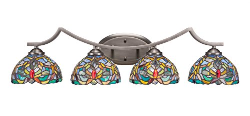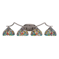 The Zilo 4 Light Bath Bar in Graphite Finish with 7-Inch Kaleidoscope Tiffany Glass is UL/CUL Listed. Product Dimensions: 8.5-inches deep x 33.25-inches long x 8-inches tall. Back plate Dimension: 5.25-inch wide x 9-inch height x D 1.25-inch. Requires 4 100-Watt medium incandescent bulbs. The beauty of Toltec Lighting's entire product line is the opportunity to create a look all your own. Toltec Lighting now offers over 40 glass shade choices, with most being available as an option on every lighting family, making the variations limitless. It really doesn't matter if a project requires Traditional, Transitional, or Contemporary styling, Toltec Lighting fixtures will fit most any decor.