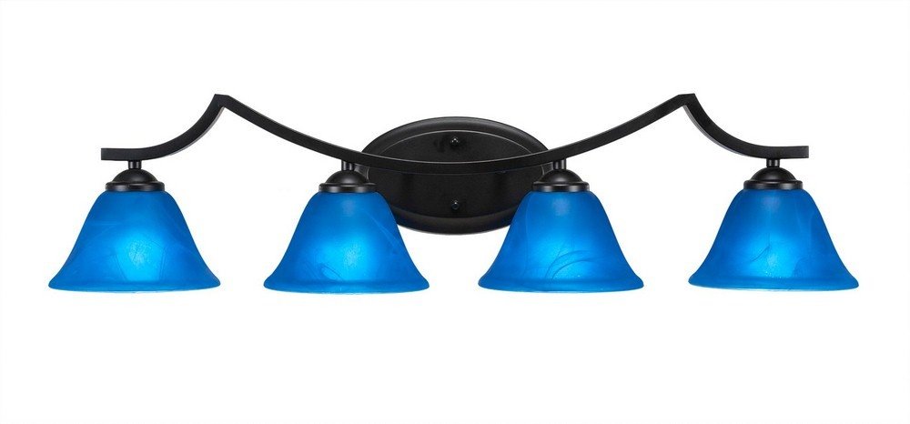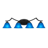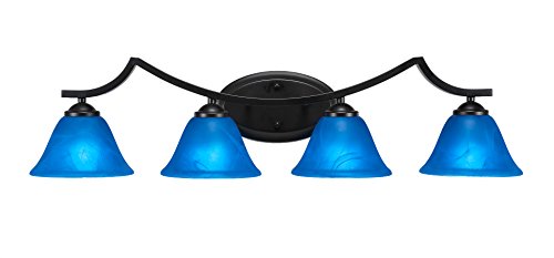 The Zilo 4 Light Bath Bar in Matte Black Finish with 7-Inch Blue Italian Glass is UL/CUL Listed. Product Dimensions: 8.5-inches deep x 32.5-inches long x 7.75-inches tall. Back plate Dimension: 5.25-inch wide x 9-inch height x D 1.25-inch. Requires 4 100-Watt medium incandescent bulbs. The beauty of Toltec Lighting's entire product line is the opportunity to create a look all your own. Toltec Lighting now offers over 40 glass shade choices, with most being available as an option on every lighting family, making the variations limitless. It really doesn't matter if a project requires Traditional, Transitional, or Contemporary styling, Toltec Lighting fixtures will fit most any decor.