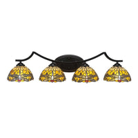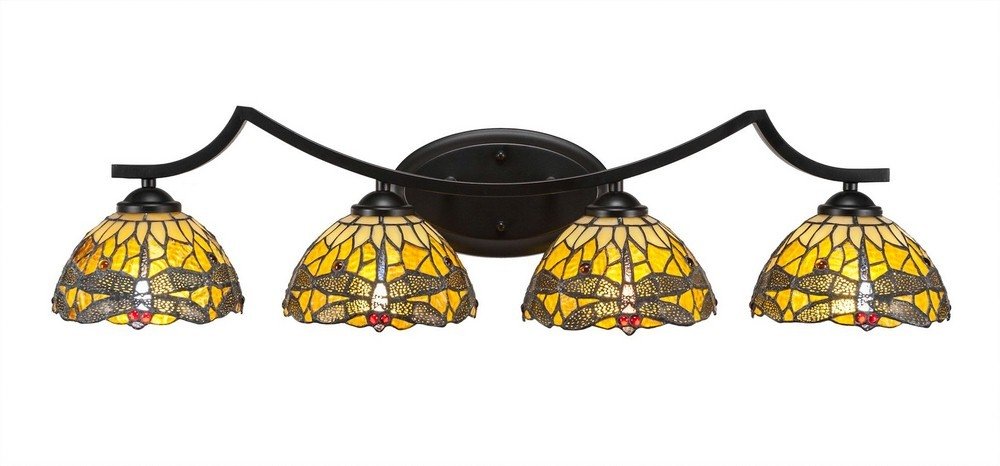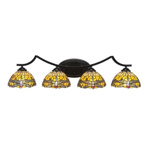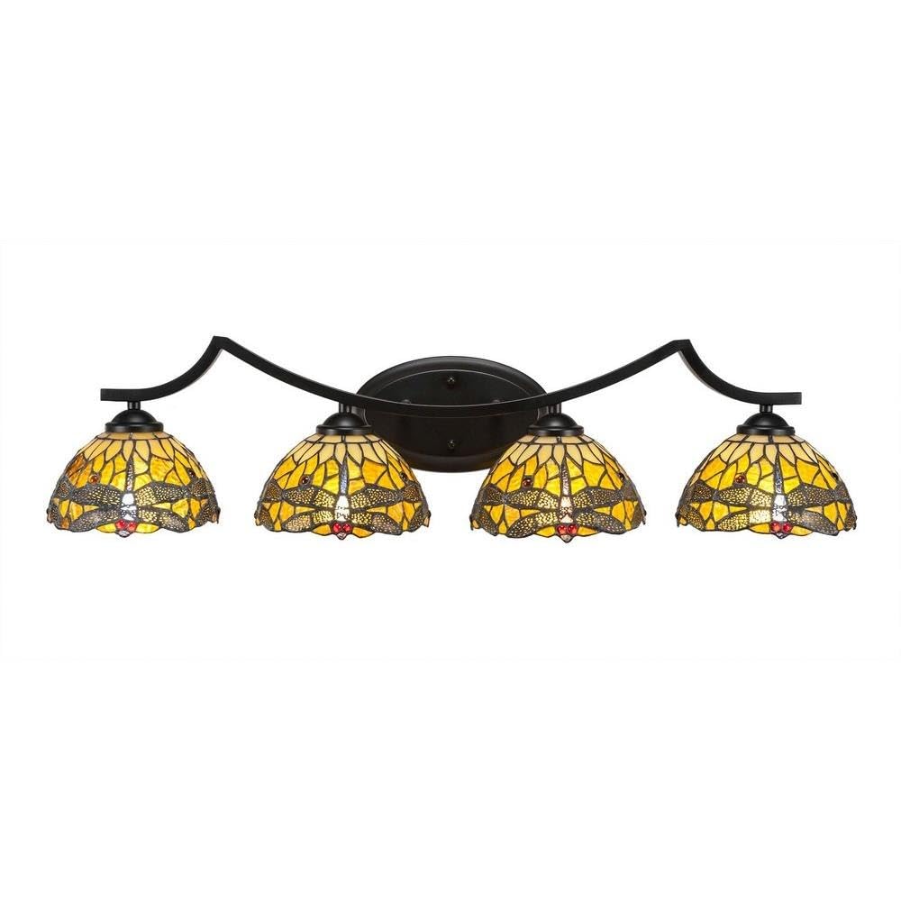 The Zilo 4 Light Bath Bar in Matte Black Finish with 7-Inch Amber Dragonfly Tiffany Glass is UL/CUL Listed. Product Dimensions: 8.5-inches deep x 32.75-inches long x 8.75-inches tall. Back plate Dimension: 5.25-inch wide x 9-inch height x D 1.25-inch. Requires 4 100-Watt medium incandescent bulbs. The beauty of Toltec Lighting's entire product line is the opportunity to create a look all your own. Toltec Lighting now offers over 40 glass shade choices, with most being available as an option on every lighting family, making the variations limitless. It really doesn't matter if a project requires Traditional, Transitional, or Contemporary styling, Toltec Lighting fixtures will fit most any decor.
