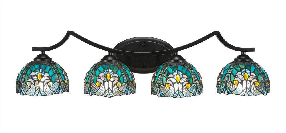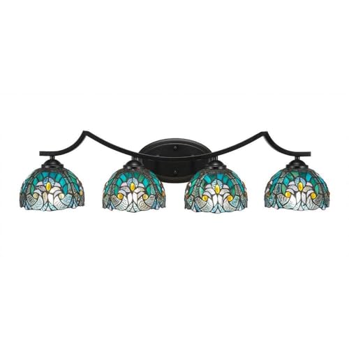 The Zilo 4 Light Bath Bar in Matte Black Finish with 7-Inch Turquoise Cypress Tiffany Glass is UL/CUL Listed. Product Dimensions: 8.5-inches deep x 32.75-inches long x 7.75-inches tall. Back plate Dimension: 5.25-inch wide x 9-inch height x D 1.25-inch. Requires 4 100-Watt medium incandescent bulbs. The beauty of Toltec Lighting's entire product line is the opportunity to create a look all your own. Toltec Lighting now offers over 40 glass shade choices, with most being available as an option on every lighting family, making the variations limitless. It really doesn't matter if a project requires Traditional, Transitional, or Contemporary styling, Toltec Lighting fixtures will fit most any decor.