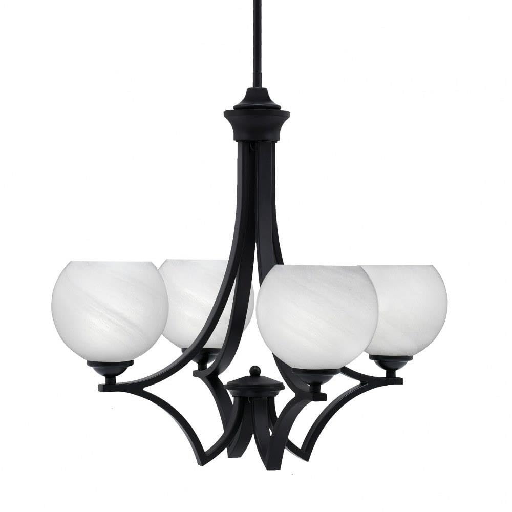 Q: What is the finish and glass color of the Zilo chandelier?A: The Zilo chandelier features a matte black finish complemented by white marble glass, providing a stylish and modern look for any room.