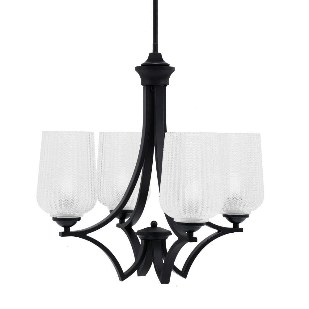 Q: What is the finish and glass color of the Zilo chandelier?A: The Zilo chandelier features a matte black finish complemented by clear textured glass, offering a modern and stylish appearance that enhances any decor.