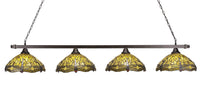 Collection: Square, Material: Steel, Finish Color: Bronze, Width: 16", Height: 12", Length: 76.75", Chain Length: 120", Lamping Type: Incandescent, Number Of Bulbs: 4, Wattage: 150 Watts, Dimmable: No, Moisture Rating: Dry Rated, Desc: Square 4 Light Bar Shown In Bronze Finish With 16" Amber Dragonfly Art Glass,