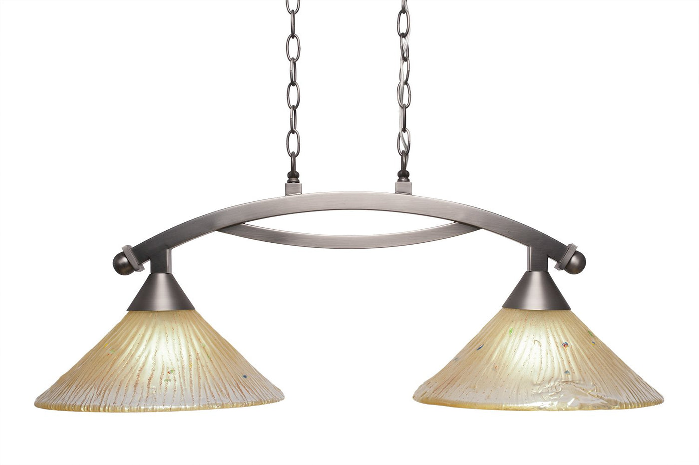 Q: What style of décor does the Toltec Lighting Bow 2 Light Island complement?A: The sleek Brushed Nickel finish and Amber Crystal glass of the Toltec Lighting Bow 2 Light Island make it a versatile choice that complements modern, contemporary, and transitional décor styles.