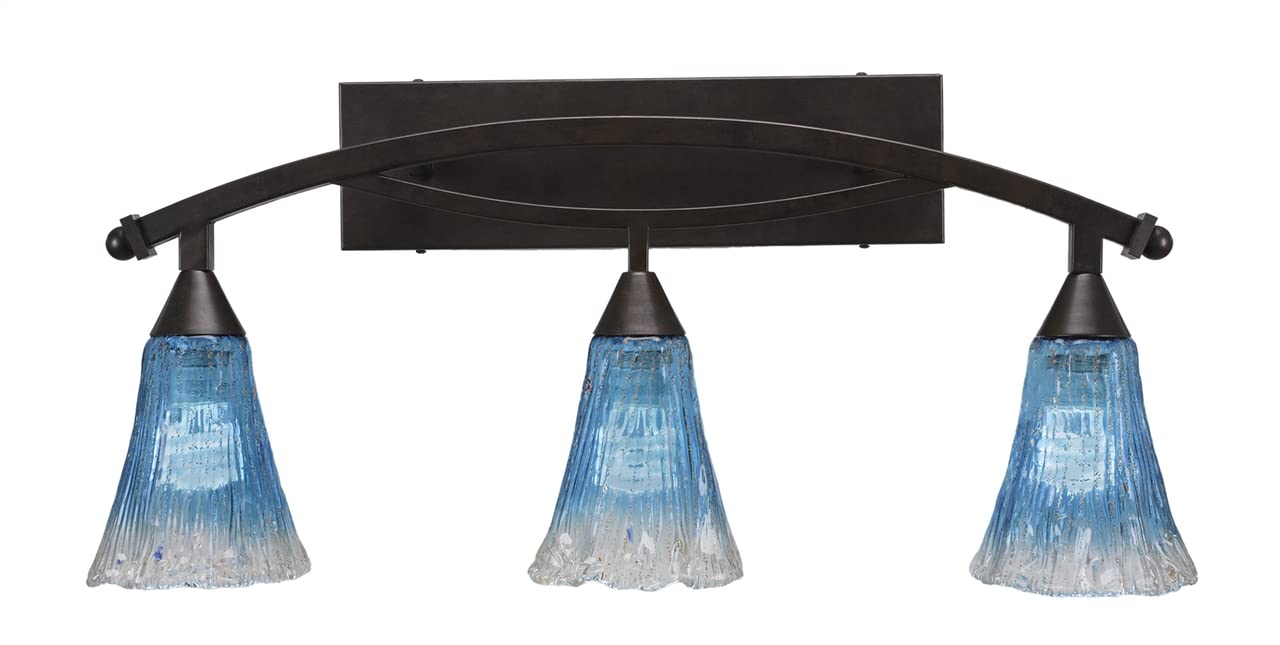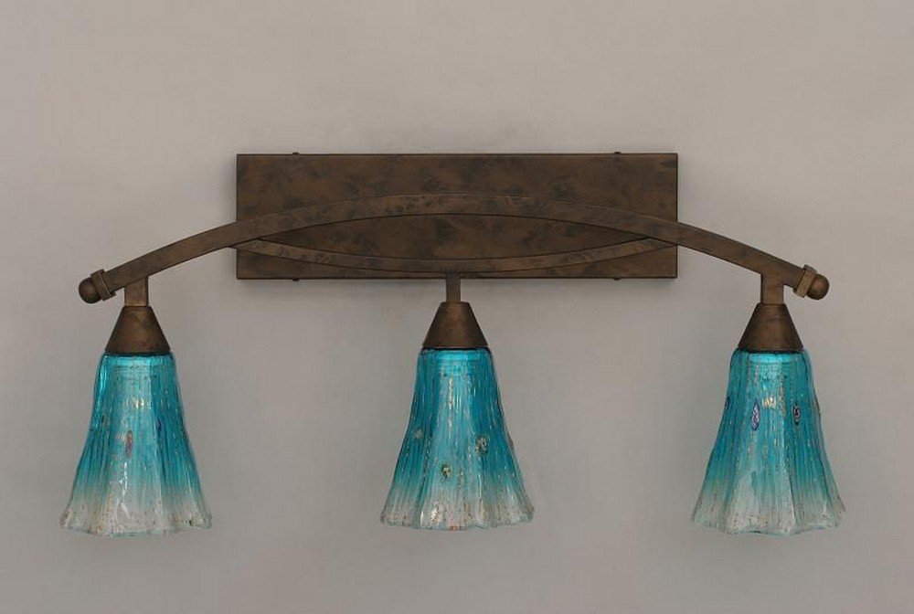 173-BRZ-725 Bow 3 Light Bath Bar Shown In Bronze Finish with 5.5" Teal Crystal Glass. Rated for: Dry location. Light Bulb Data: 3 Medium 100 watt. Bulb included: No.